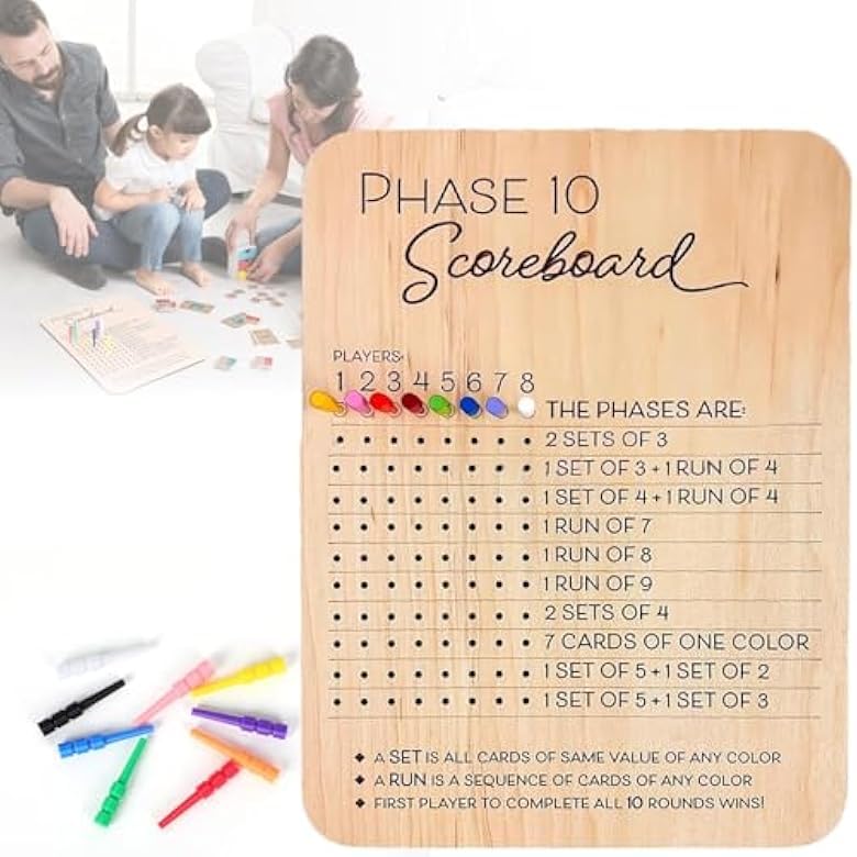 Tablero de puntuación de la fase 10, marcador de madera de la fase 10 2025 y rastreador redondo con 8 clavijas de colores, hojas d