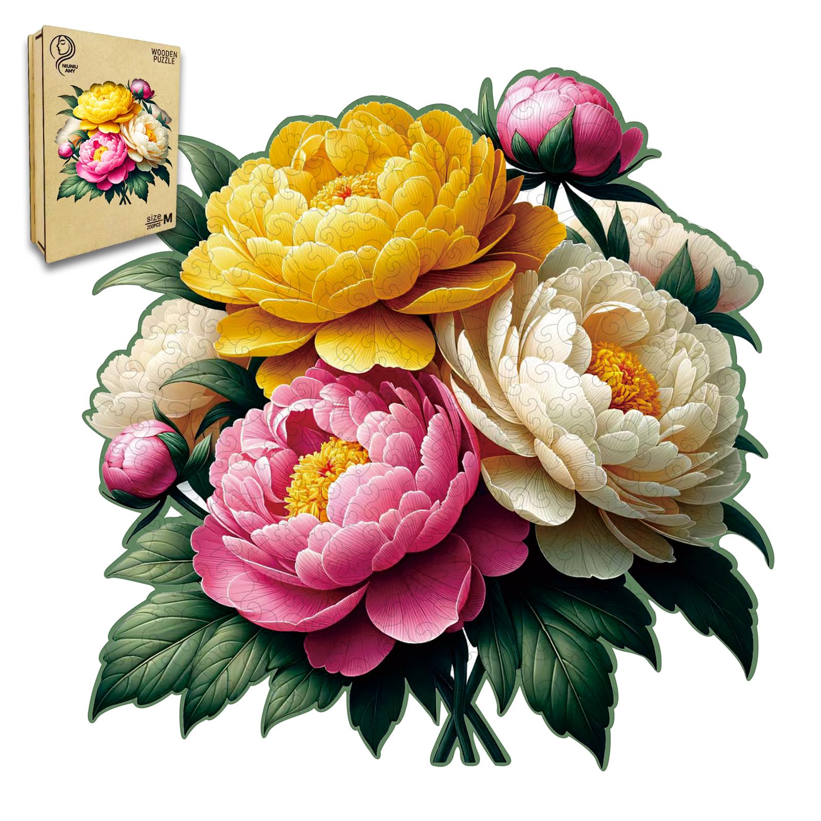 Rompecabezas de madera, flor de peonía multicolor, rompecabezas de madera para adultos, rompecabezas de tallado de madera colorido