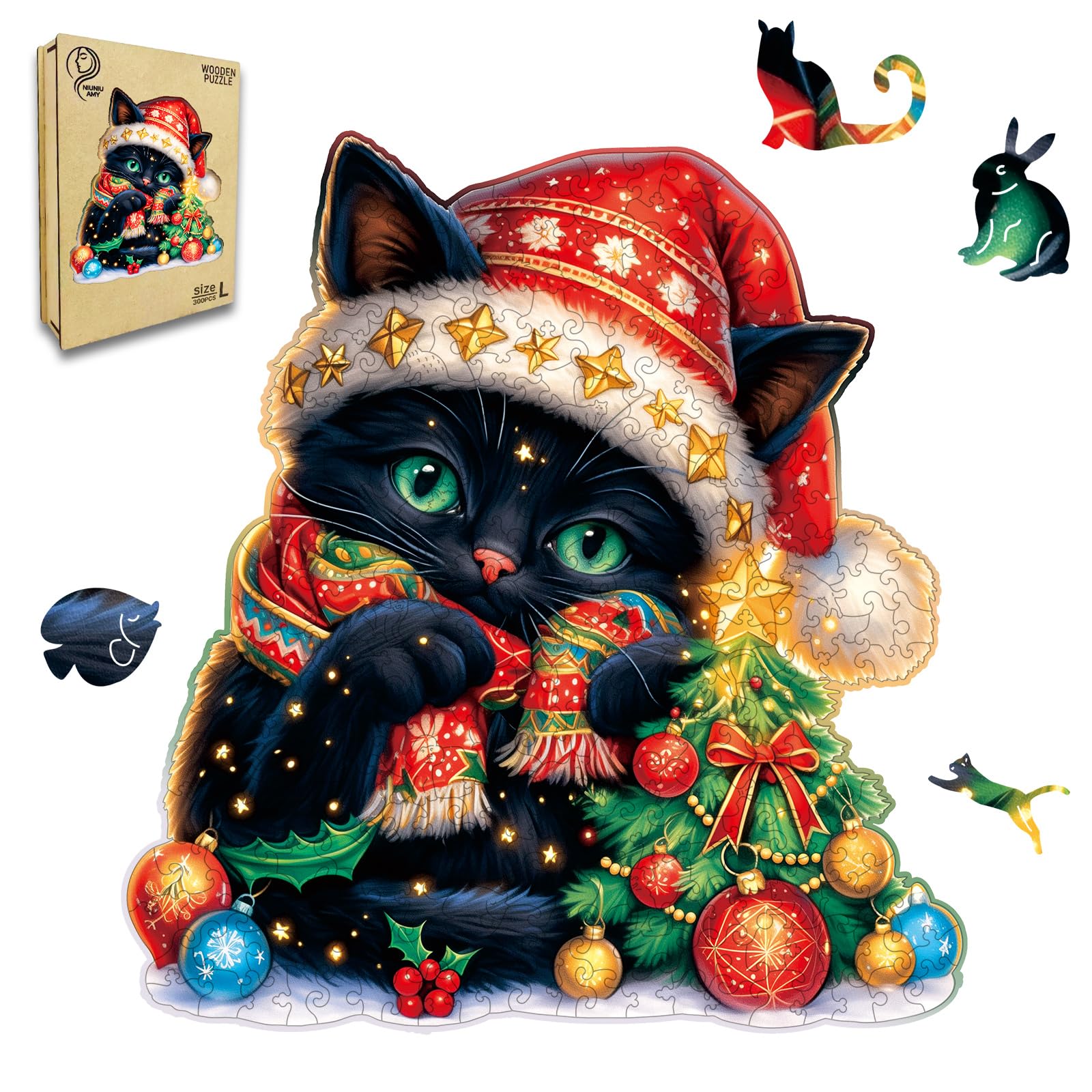 Rompecabezas de madera para adultos, rompecabezas de gato de Navidad de 300 piezas, rompecabezas de forma única de 14.9 x 14.9 pul