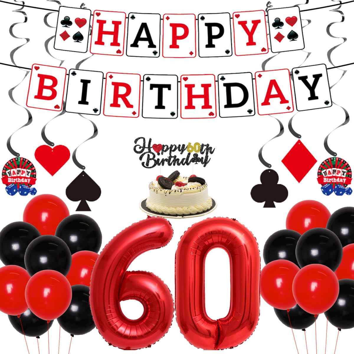 Decoraciones de fiesta de 60 cumpleaños de casino, globo número 60, pancarta de feliz cumpleaños y decoración de pastel, remolinos