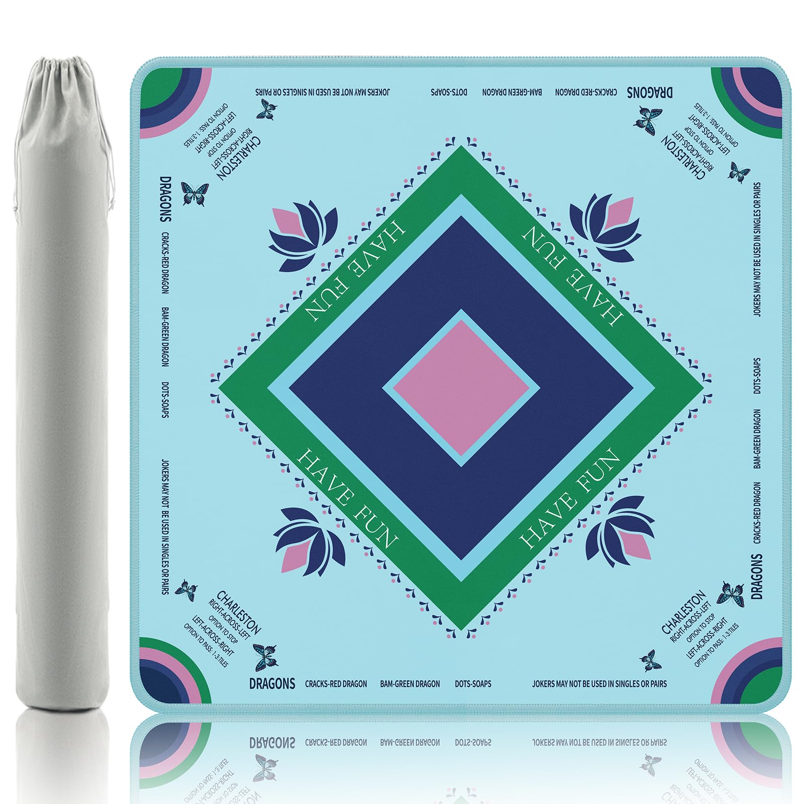 Tapete Mahjong turquesa con ilustraciones de loto y mariposa, 32.4 x 32.4 pulgadas, alfombra de goma pintada a mano, superficie im