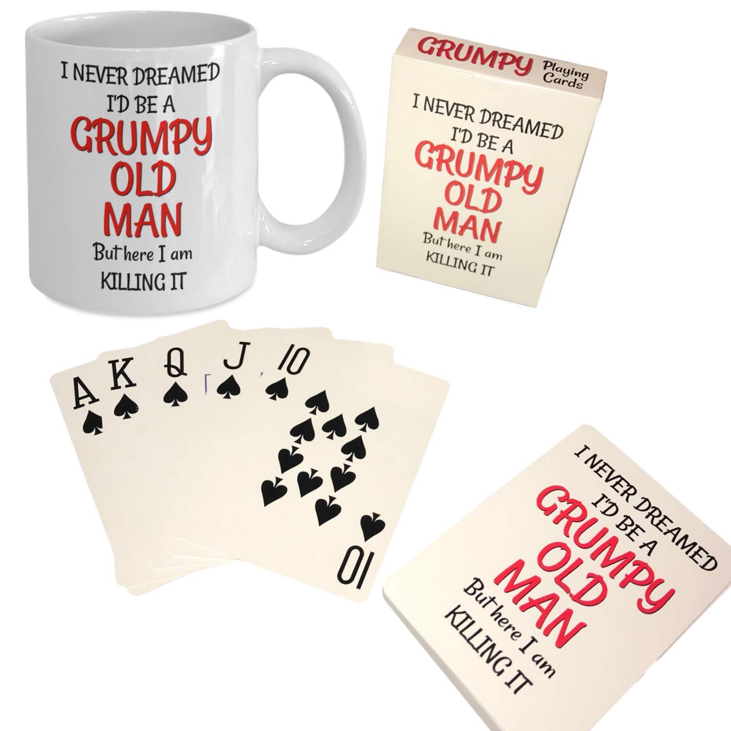Grumpy Old Man Gag Gift Set – 50, 60, 70, 75, 80 cumpleaños, taza y jumbo, cartas de juego de letras grandes para personas mayores