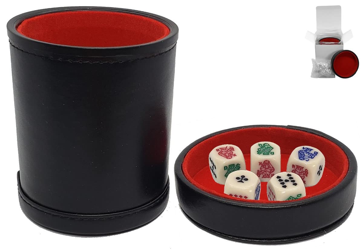 Juego de dados de póquer en tono marfil de 0.630 in con esquinas redondeadas y dados de piel sintética negra, forro de fieltro de