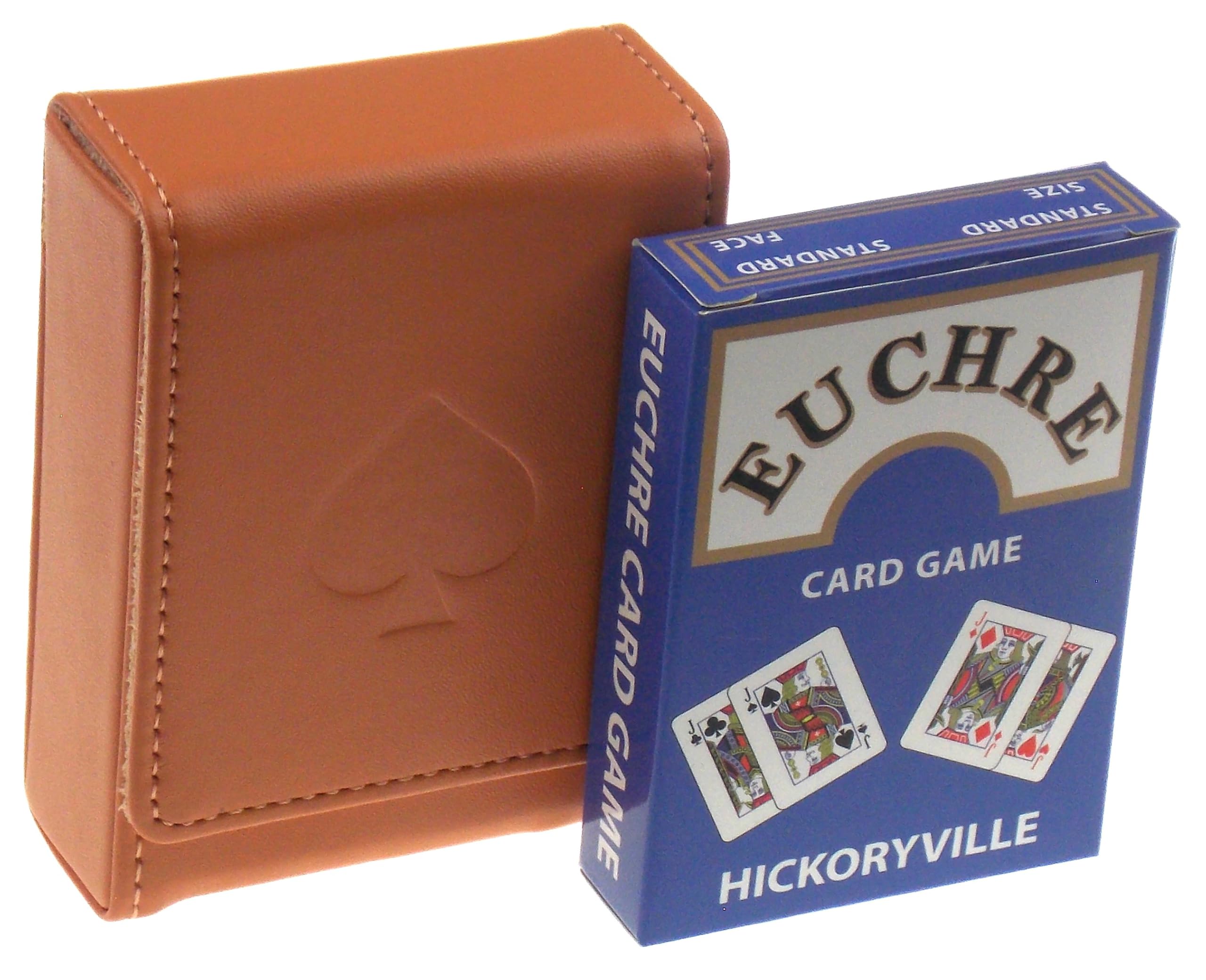 Hickoryville Euchre – 2 barajas Euchre en 1 caja con estuche de almacenamiento de cuero marrón