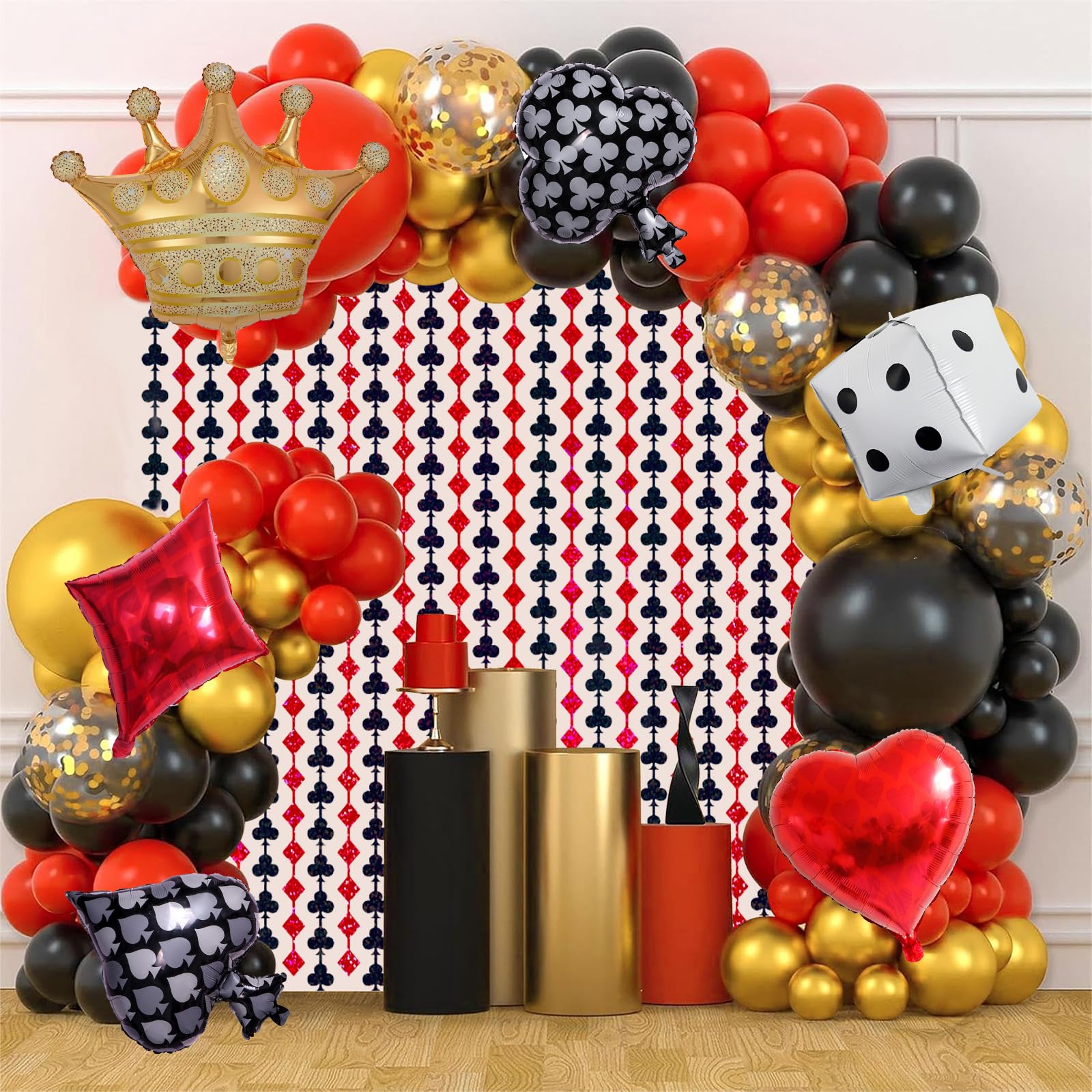Decoraciones de fiesta de casino, kit de guirnalda de arco de globos de casino, rojo, negro y dorado, corona de dados de póquer, c