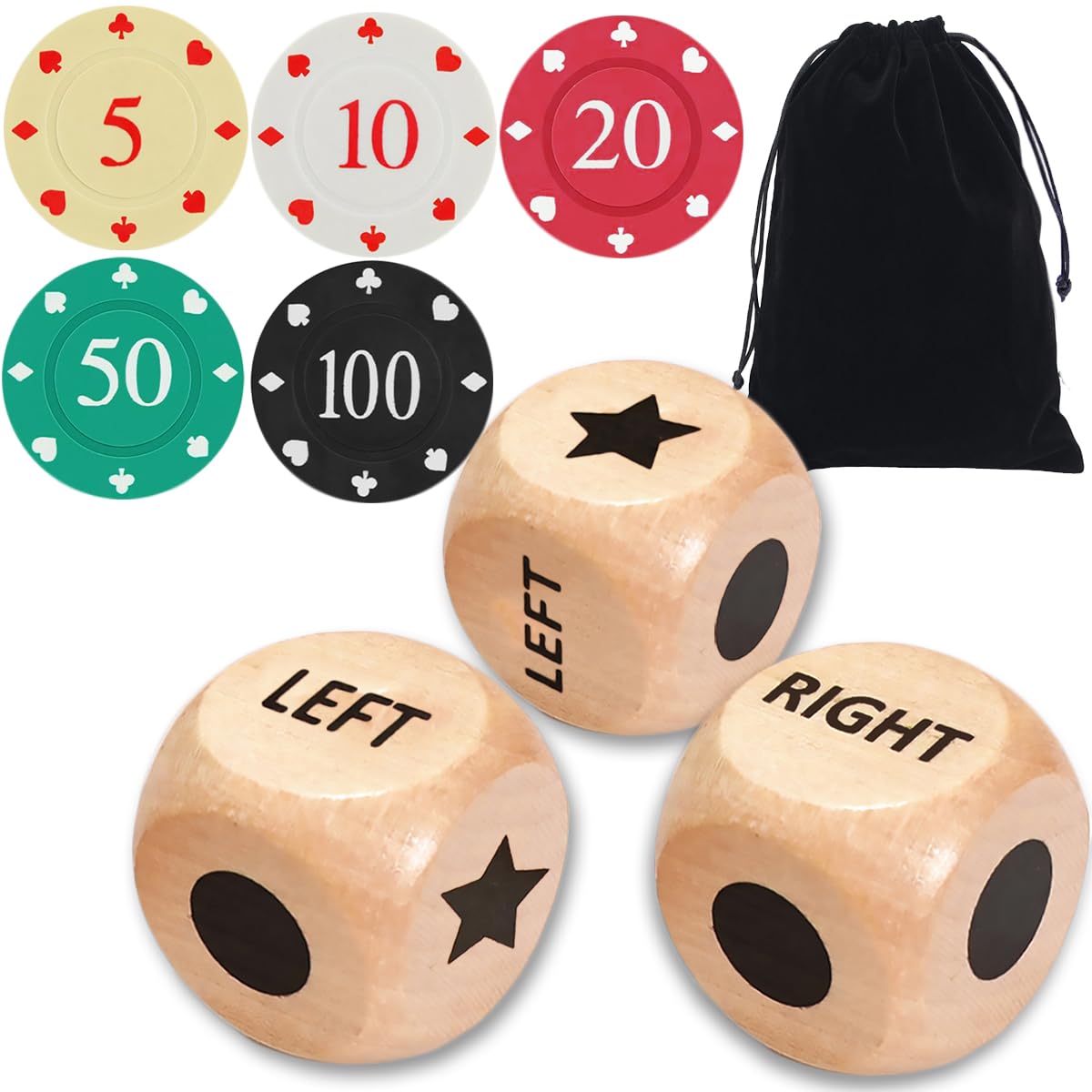ZLIXING Juego de dados de 3 piezas con 50 fichas de póquer para centro izquierdo y derecho, juego de dados familiares, juegos de m