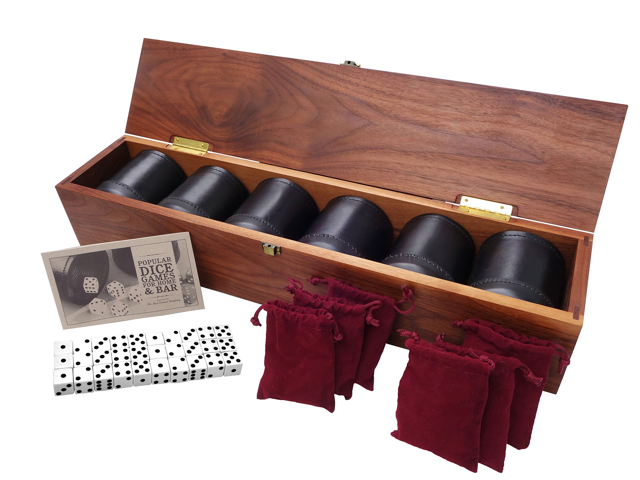 Golden Gate – Juego de seis vasos de dados en nogal, incluye treinta dados blancos y un libro de juegos de dados (incluye dados de