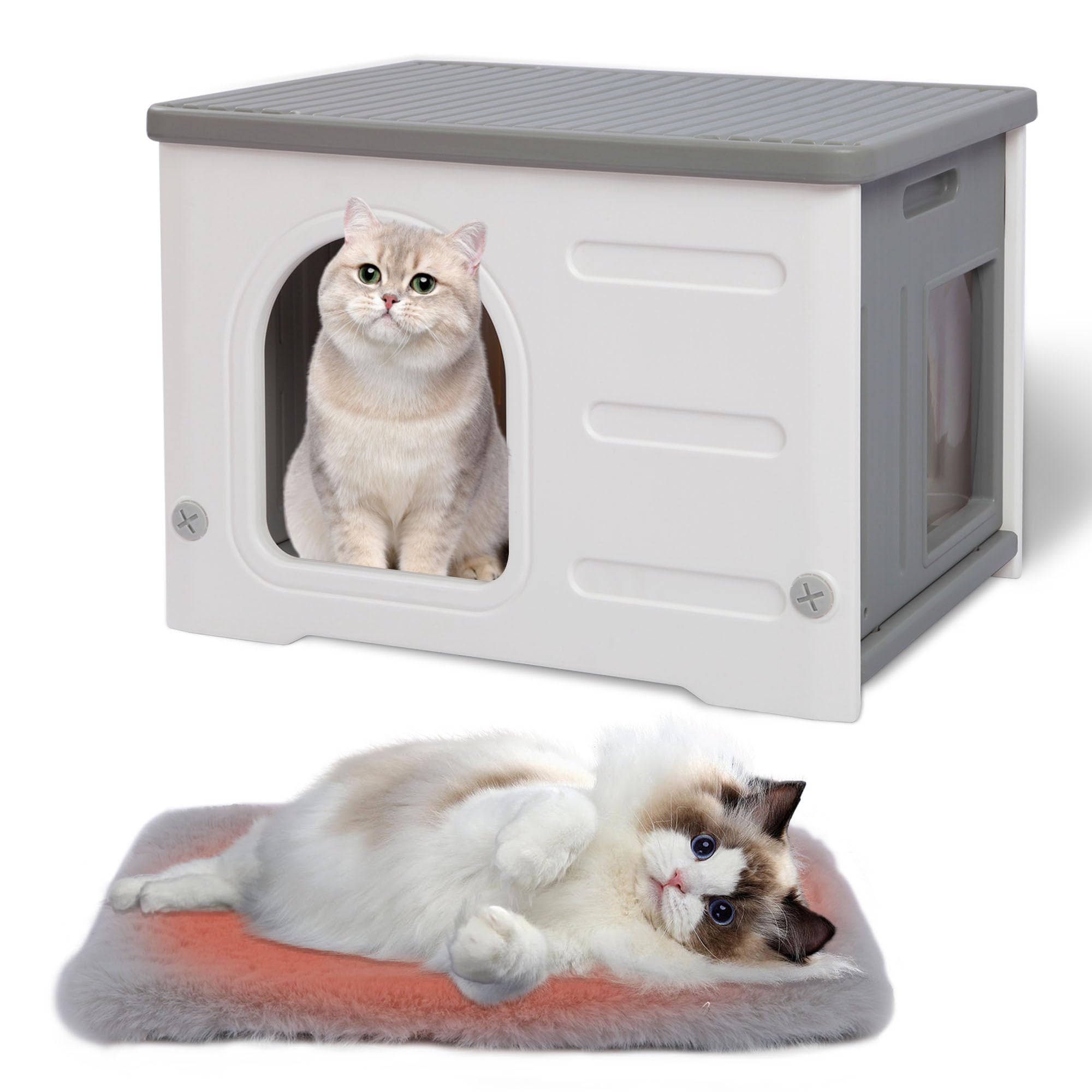 Casa de plástico para gatos para interiores, refugio impermeable para gatos con alfombra, puerta de escape, casa grande y resisten