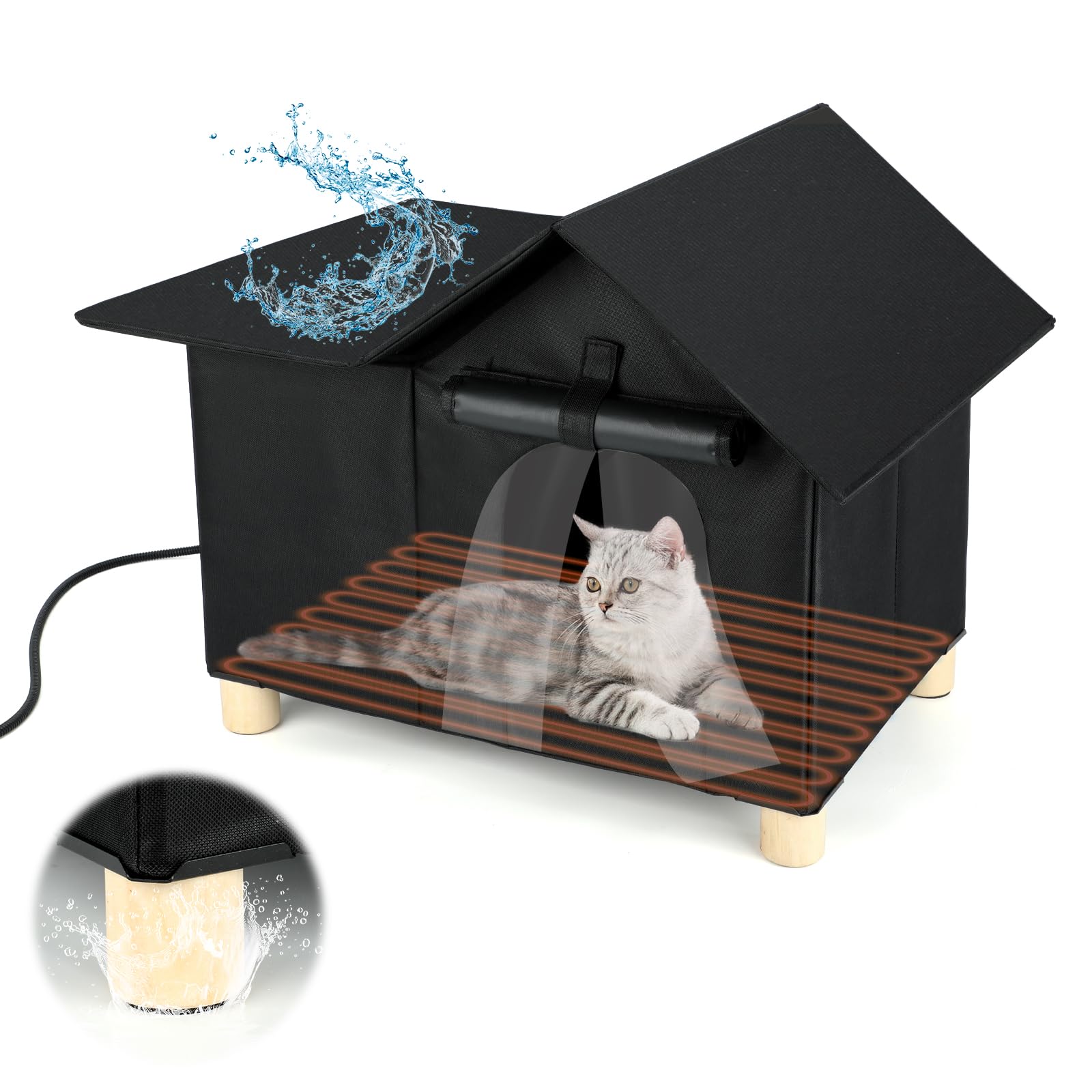 Casa climatizada para gatos para exteriores, base elevada 100% impermeable, refugio aislado para gatos al aire libre con calentado