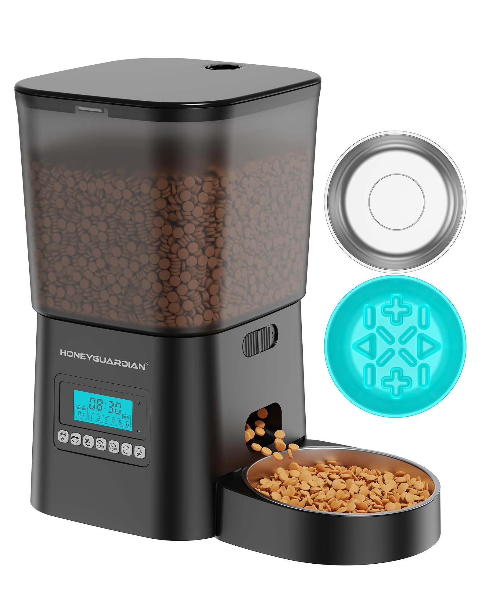 HoneyGuaridan Comedero automático para gatos, dispensador de comida para gatos con cuenco de acero inoxidable y tazón lento, comed