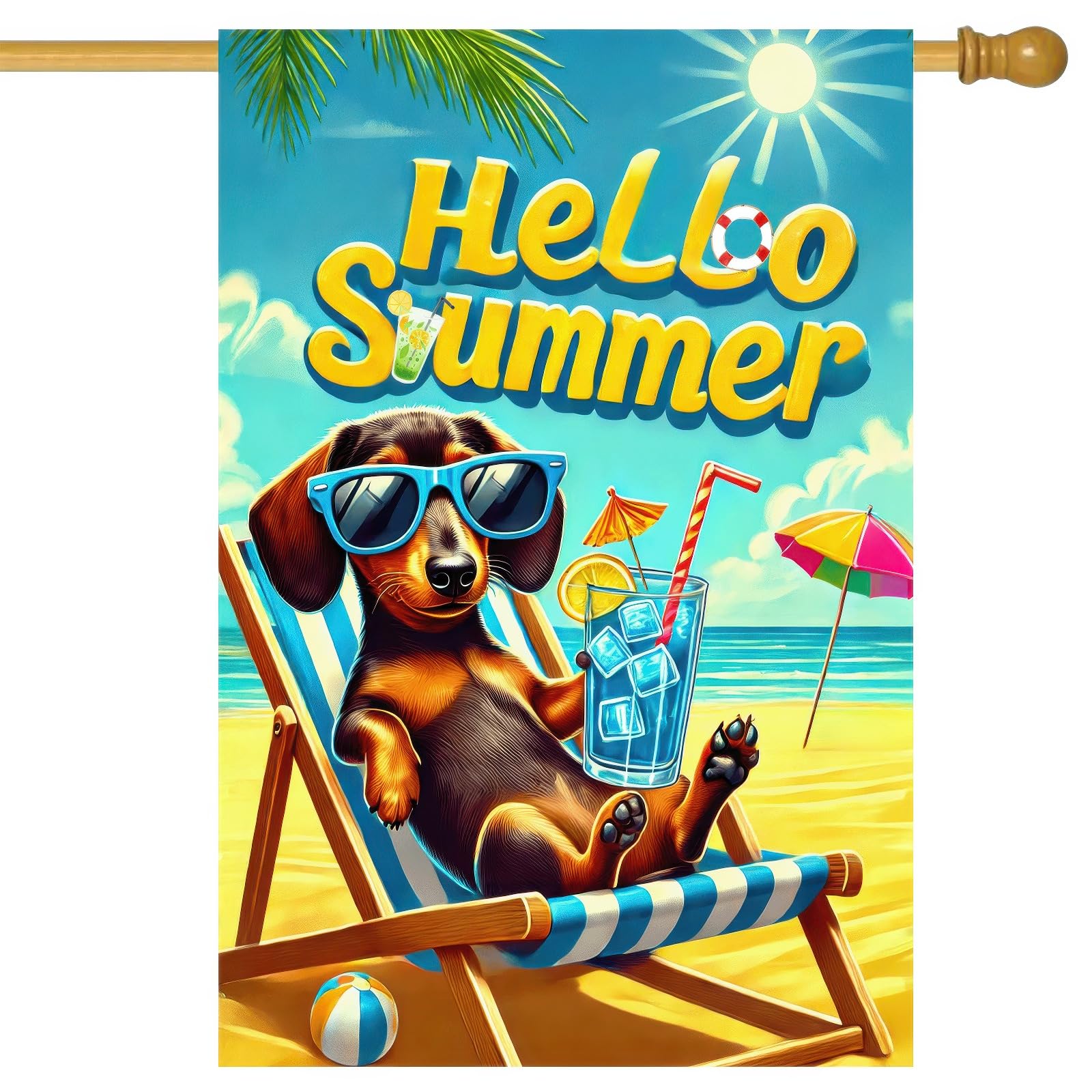 Bandera de jardín de verano con perro salchicha de 28 x 40 pulgadas, bandera de casa de doble cara con silla de playa, diseño de p