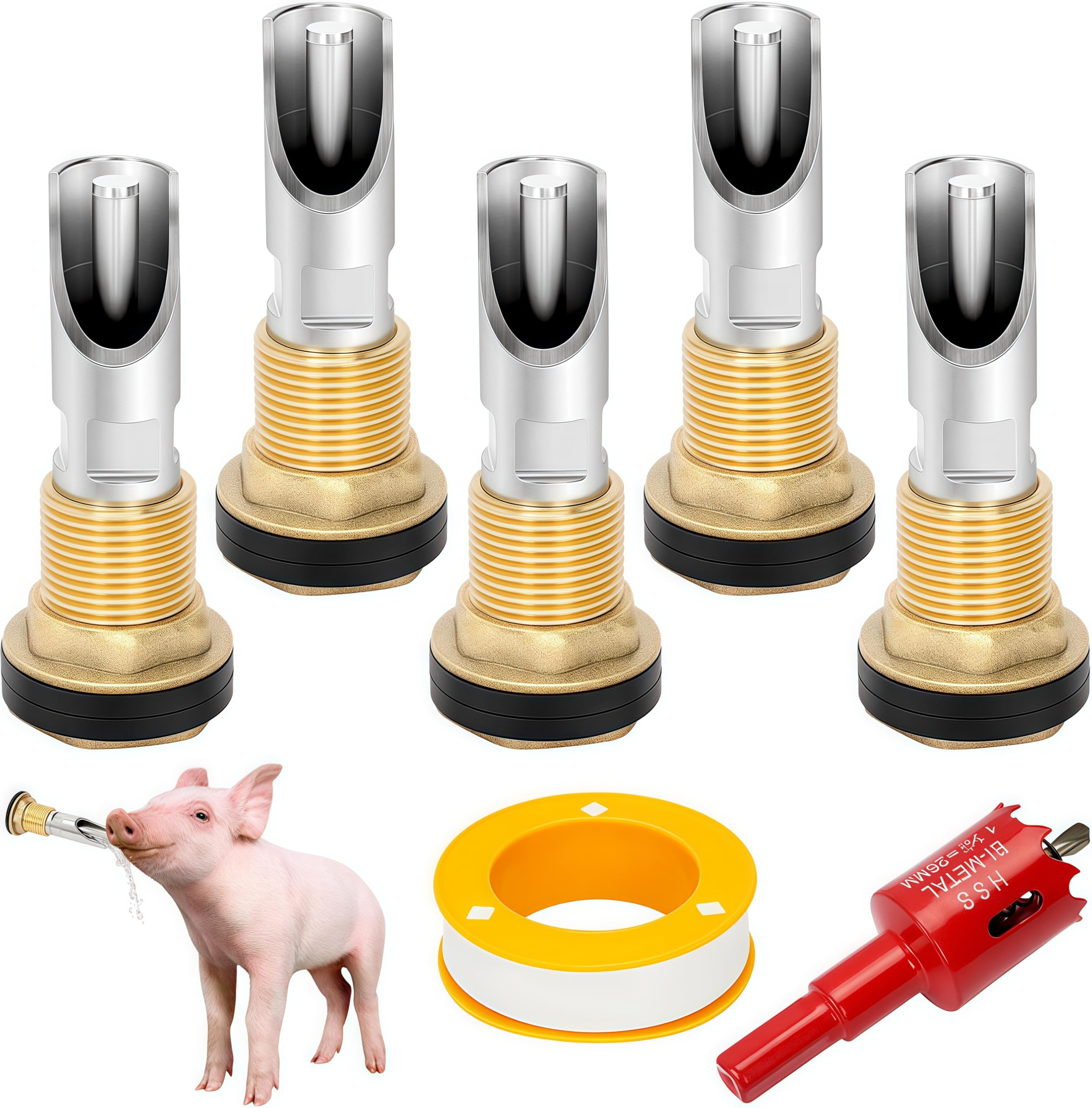 5 pezones de agua para cerdo, bebedero automático de acero inoxidable con conector de tanque de agua de latón, broca y cinta de 32