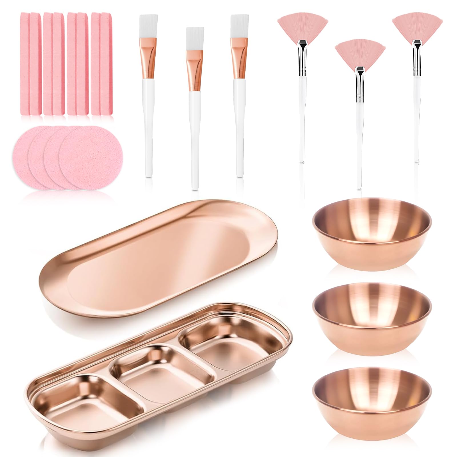 23 unidades de suministros de esteticista de oro rosa, 3 cuencos de mezcla de mascarillas faciales de acero inoxidable, 3 cepillos