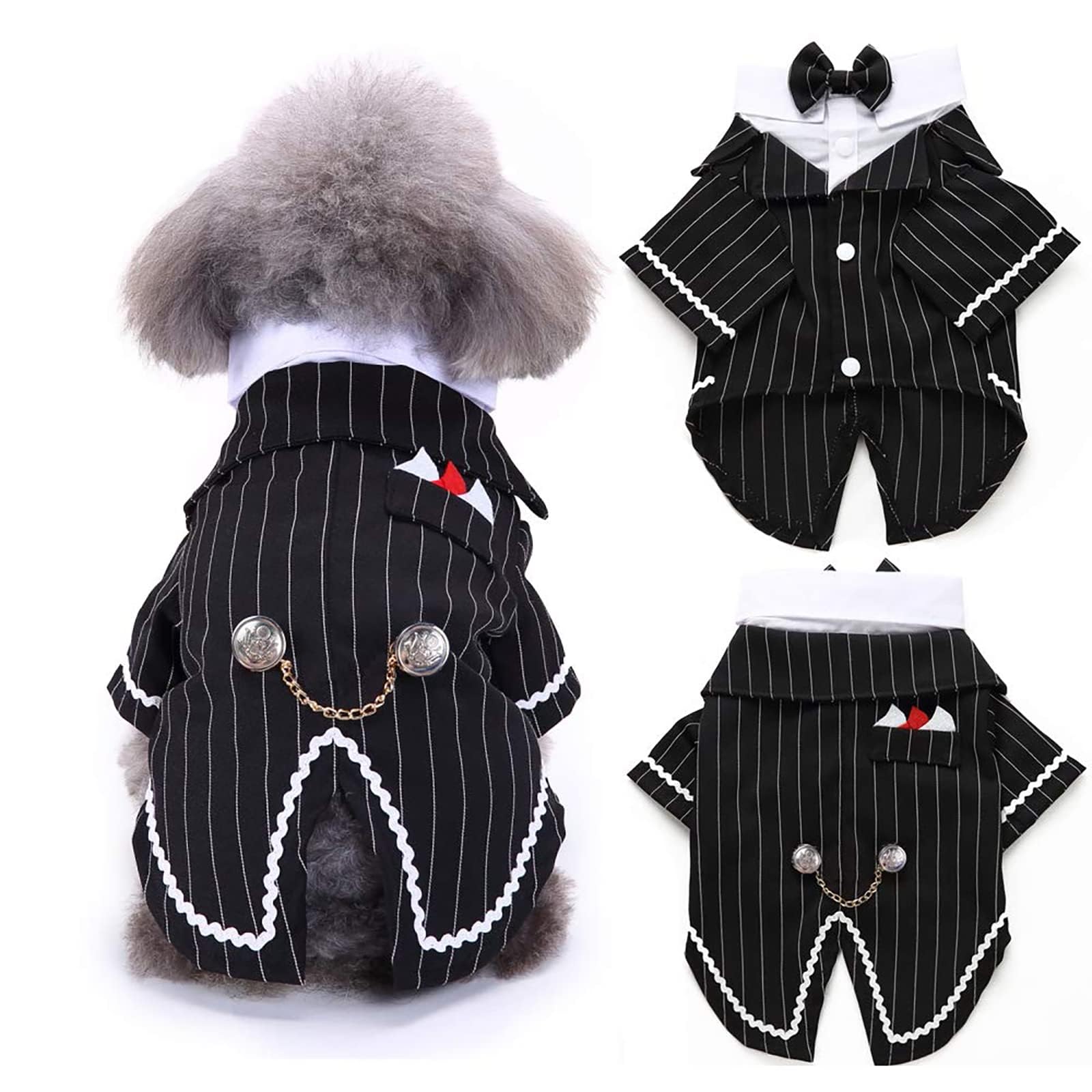 DENTRUN Traje de esmoquin para perro con pajarita, camisa formal de disfraz de mascota a rayas blancas y negras, elegante traje de