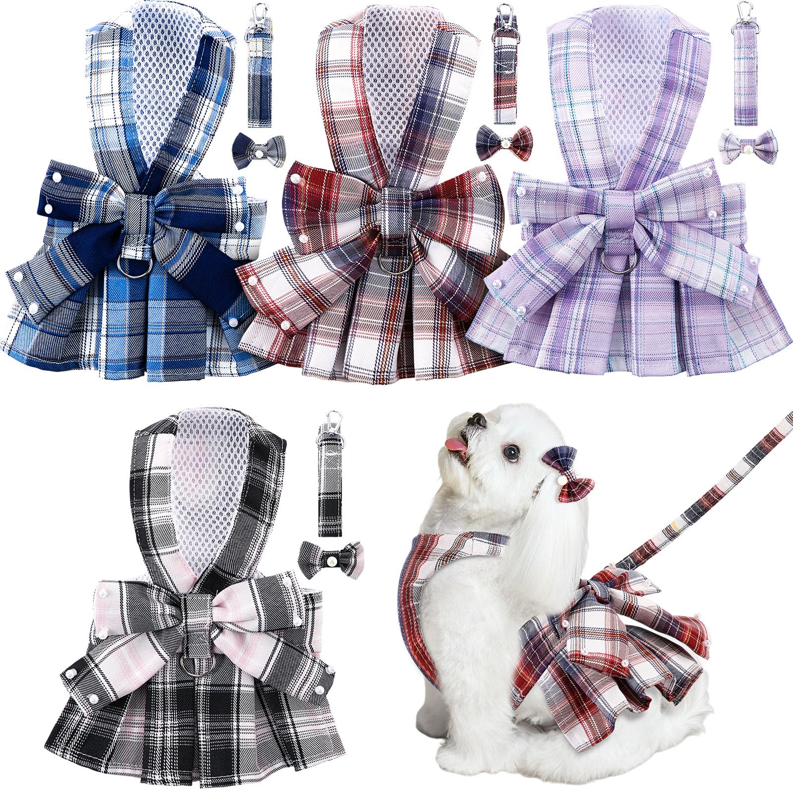 4 piezas de vestido a cuadros para perro con perlas, corbatín, arnés y correa, lindo vestido para cachorros para perros pequeños,