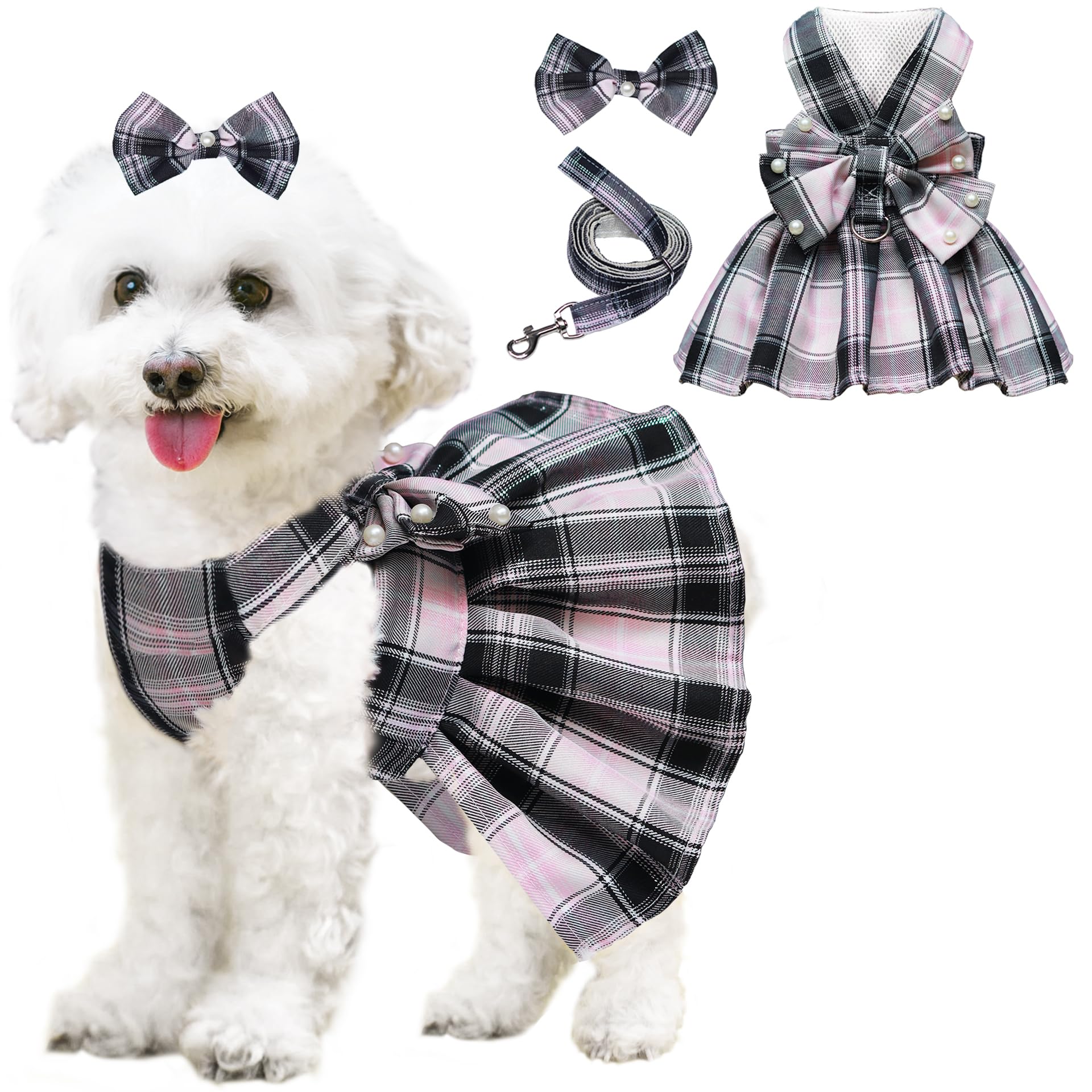 Vestido de perro con lazo y arnés y correa para perros pequeños, bonito vestido a cuadros para perro, perlas, corbatín, primavera