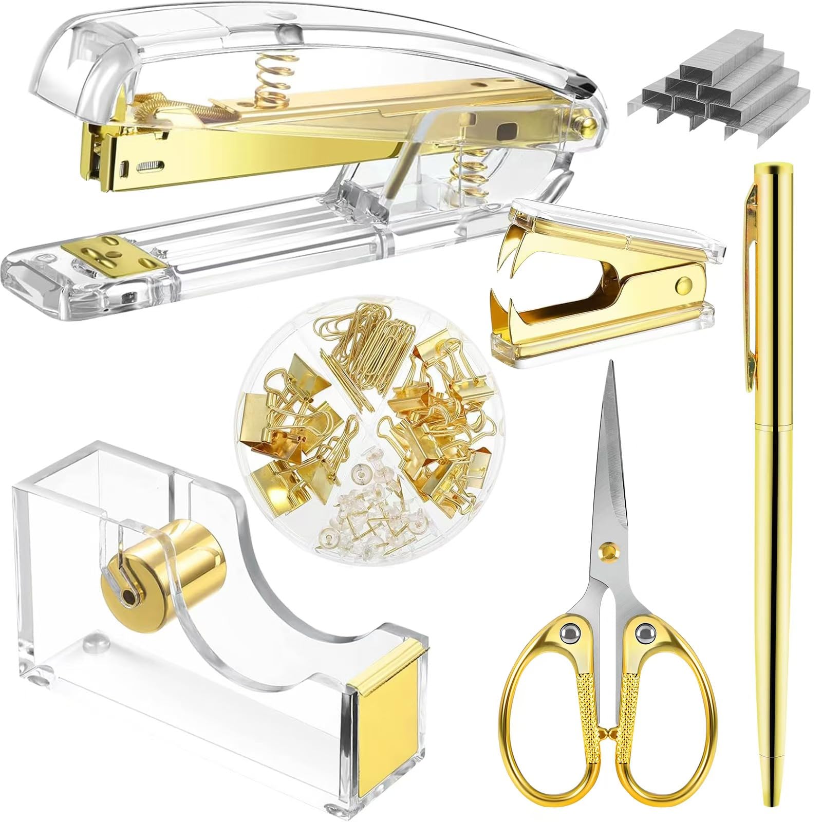 Dispensador de cinta acrílica dorada, juego de grapas de escritorio, suministros de oficina, incluye removedor de grapas, dispensa