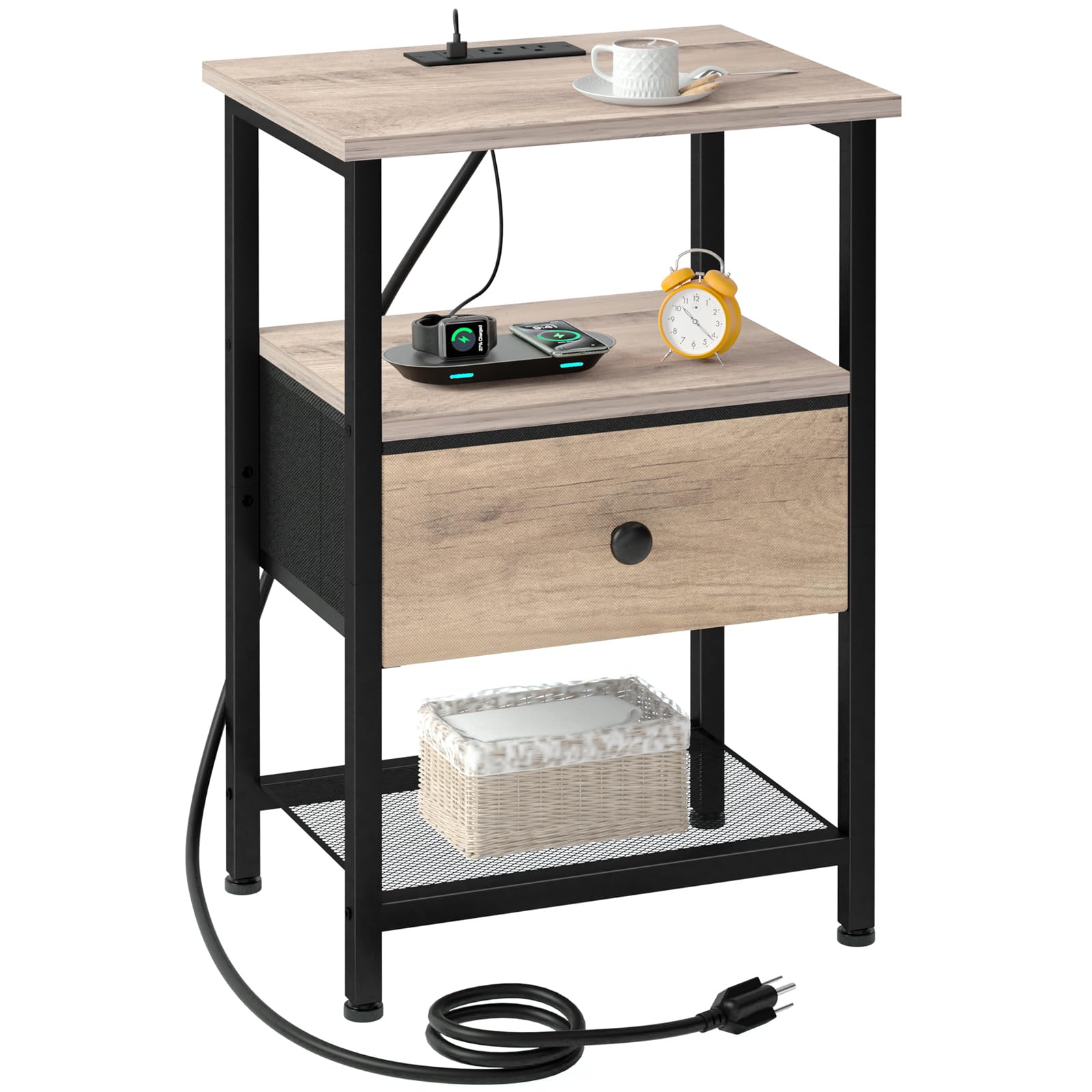 Mesita de noche con estación de carga, mesa auxiliar con cajón de tela de almacenamiento, mesita de noche para dormitorio, mesa au