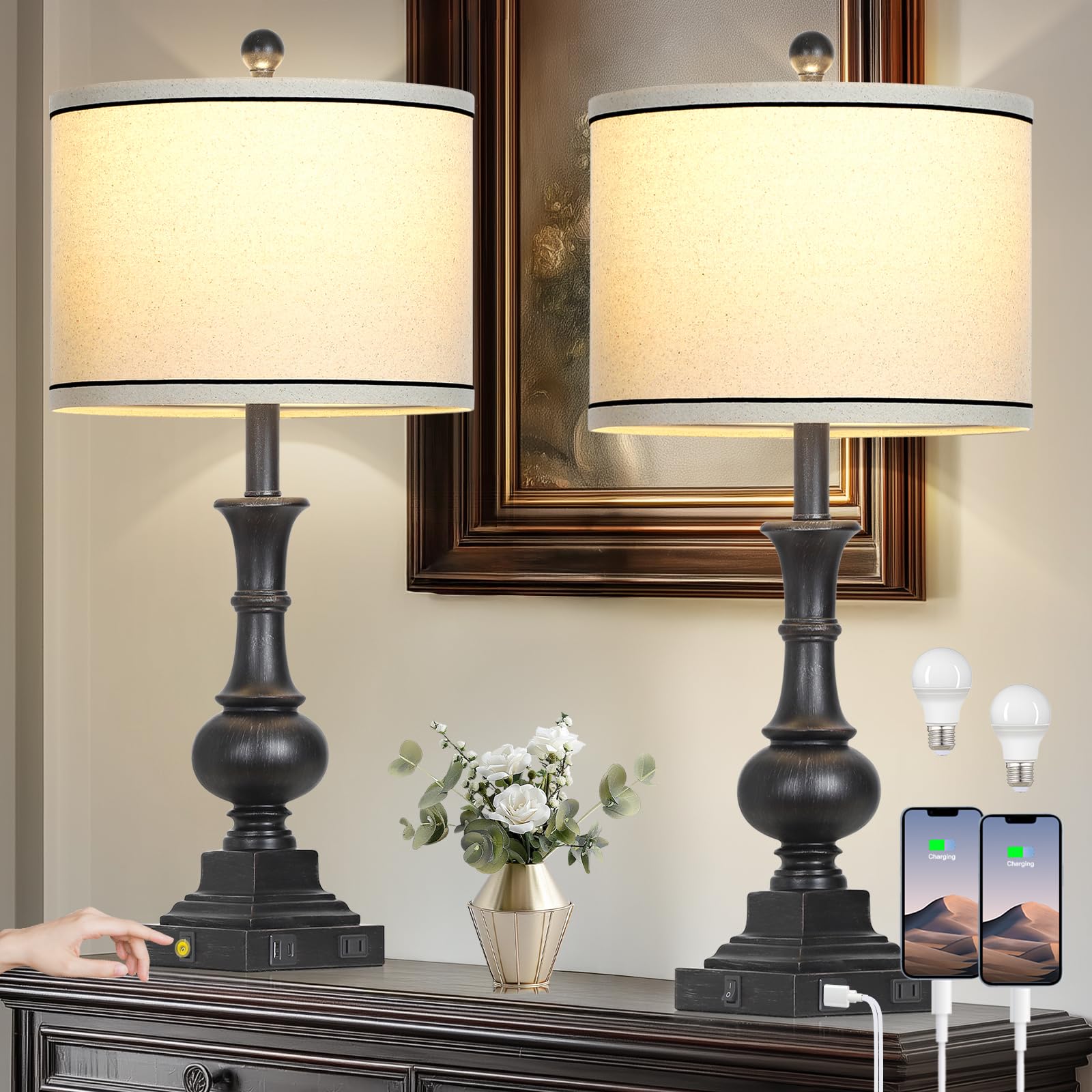 Morden Farmhouse – Juego de 2 lámparas de mesa con control táctil con 2 puertos USB y salida de CA, lámpara de mesita de noche vin