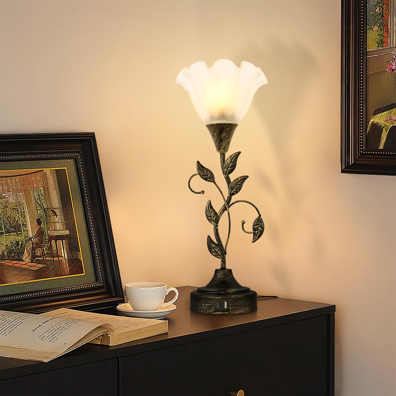 Lámpara de mesa táctil con puertos de carga USB C+A, lámpara de noche de flores para mesita de noche, regulable de 3 vías, decorac