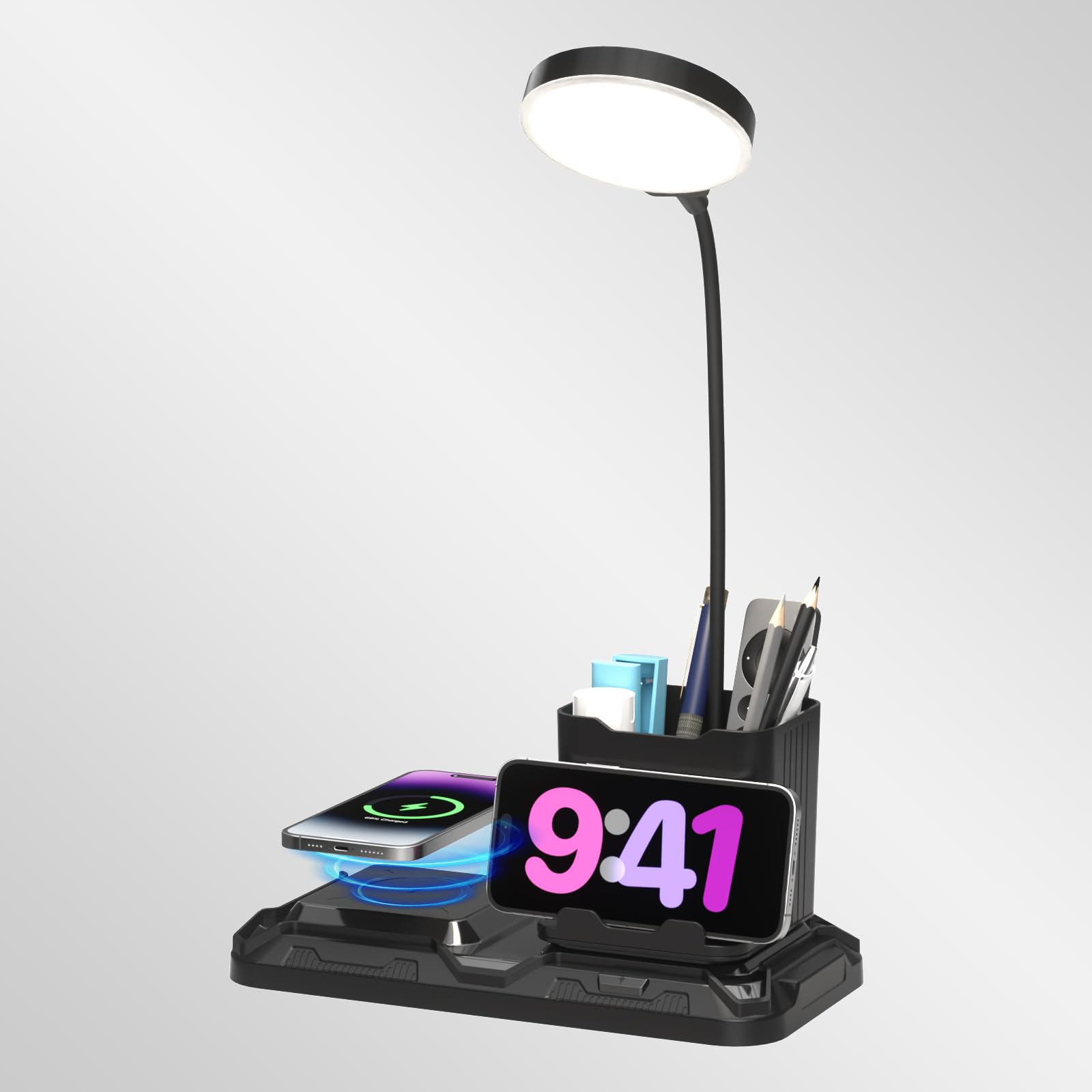 KDD Lámpara de escritorio 4 en 1 con cargador inalámbrico, lámpara de mesa pequeña de cuello de cisne giratoria de 360° con soport