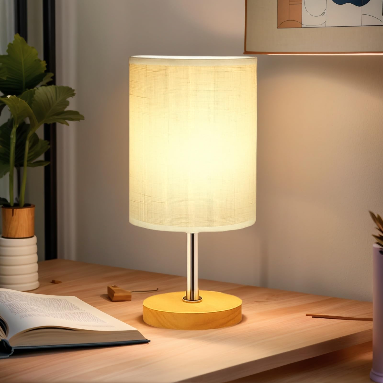 Bedside Night Table Lamp for Bedroom, Small Nightstand Lamp with 3000K E27/E26 LED Blub, Study Reading Wood Base Desk Lamp for Kid