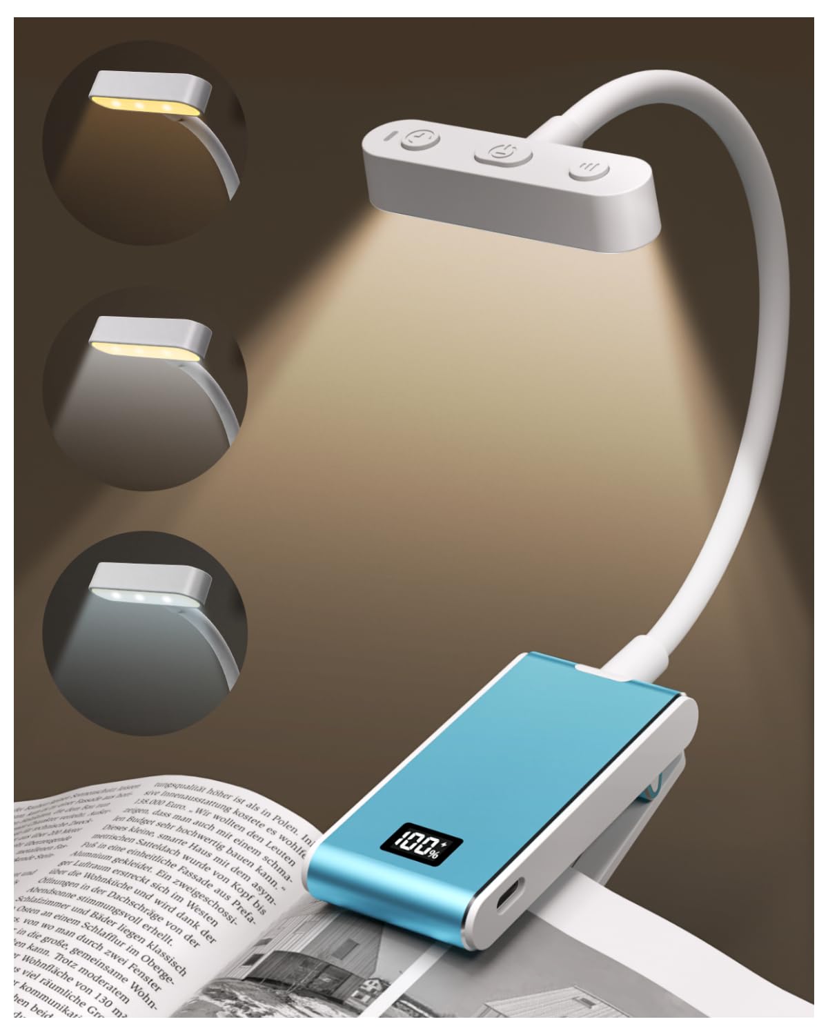 Luz de clip – 5 colores y 5 brillos de luz de lectura para el cuidado de los ojos, lámpara de escritorio de cuello flexible recarg