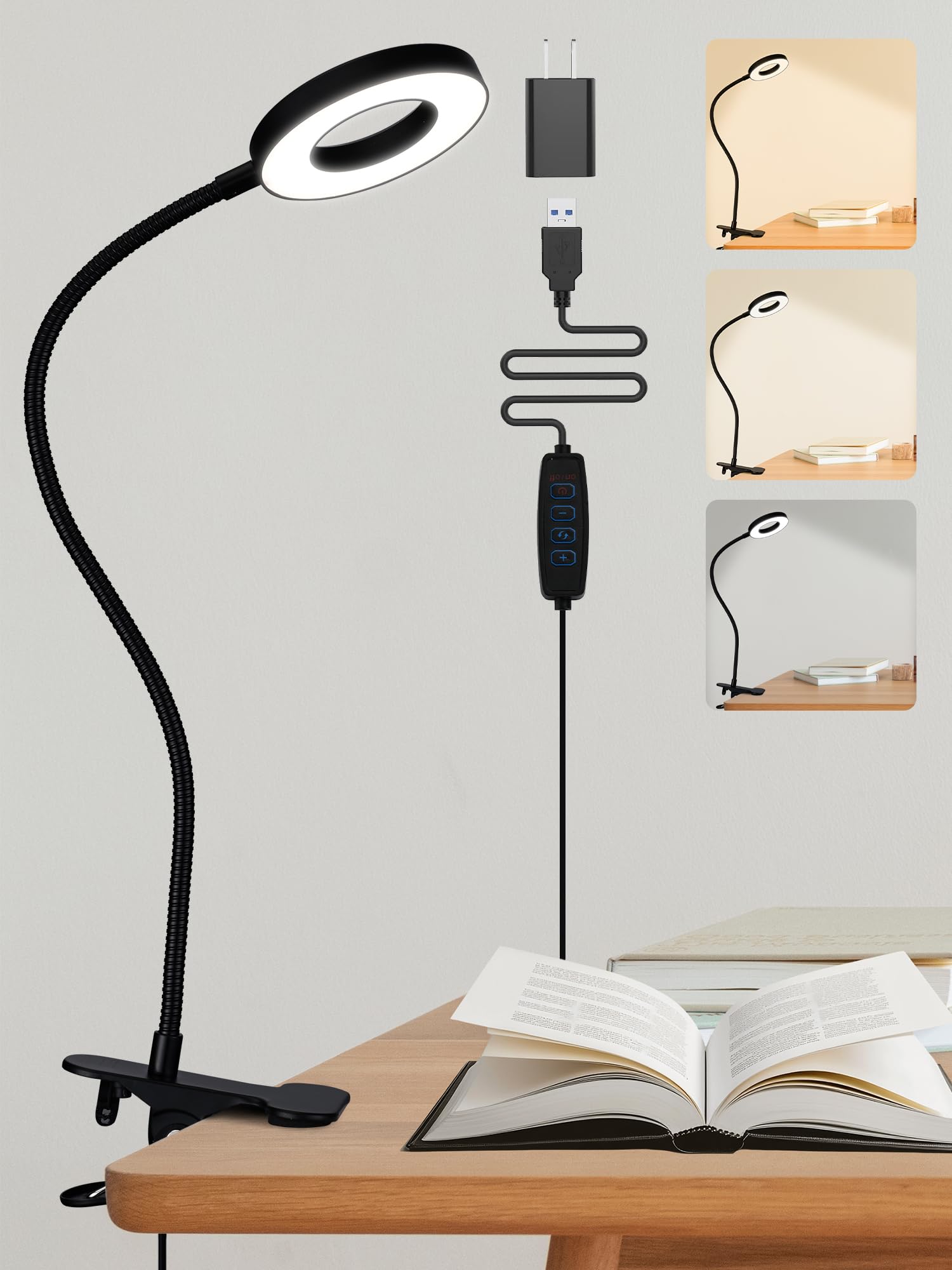 Luz de lectura con clip para cabecera de cama, lámpara de escritorio recargable por USB para dormitorio, esencial de 5 W, 3 colore