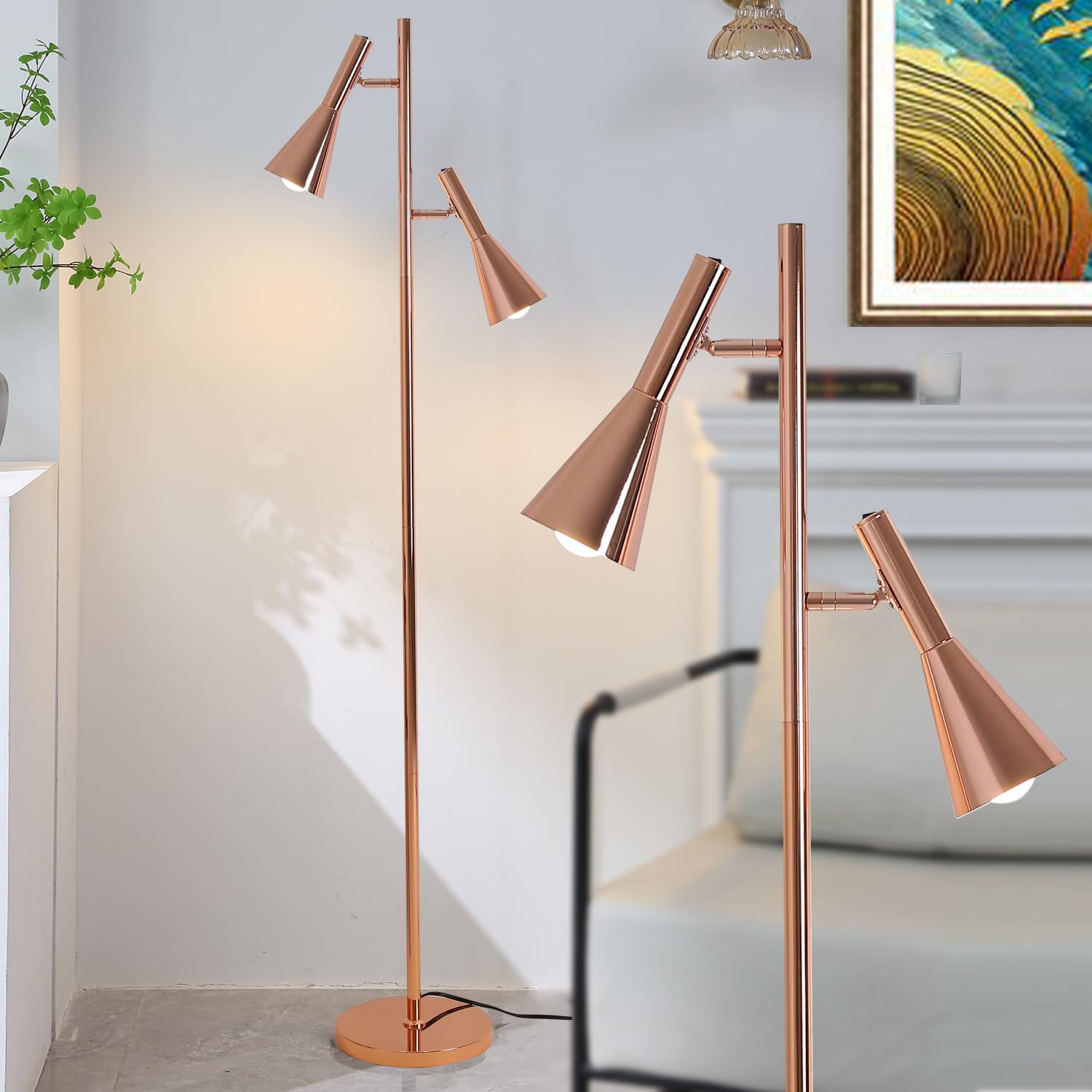 Lámpara de pie moderna con 2 cabezales ajustables para sala de estar, dormitorio, oficina, luz de esquina de oro rosa para lectura