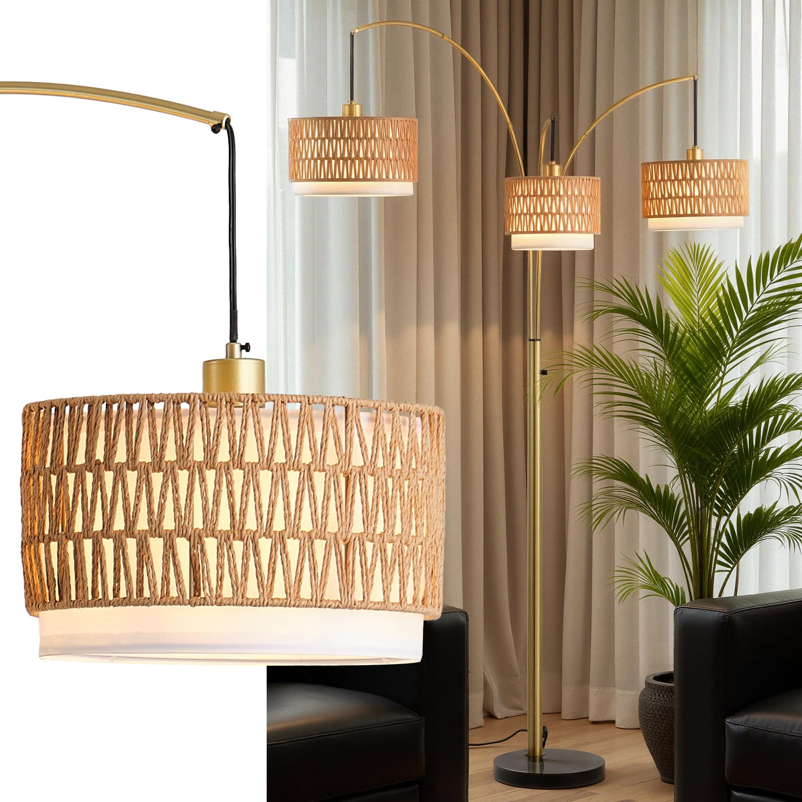 Lámpara de pie de ratán dorado para sala de estar, lámpara de pie bohemia de 80 pulgadas de alto con interruptor giratorio, lámpar