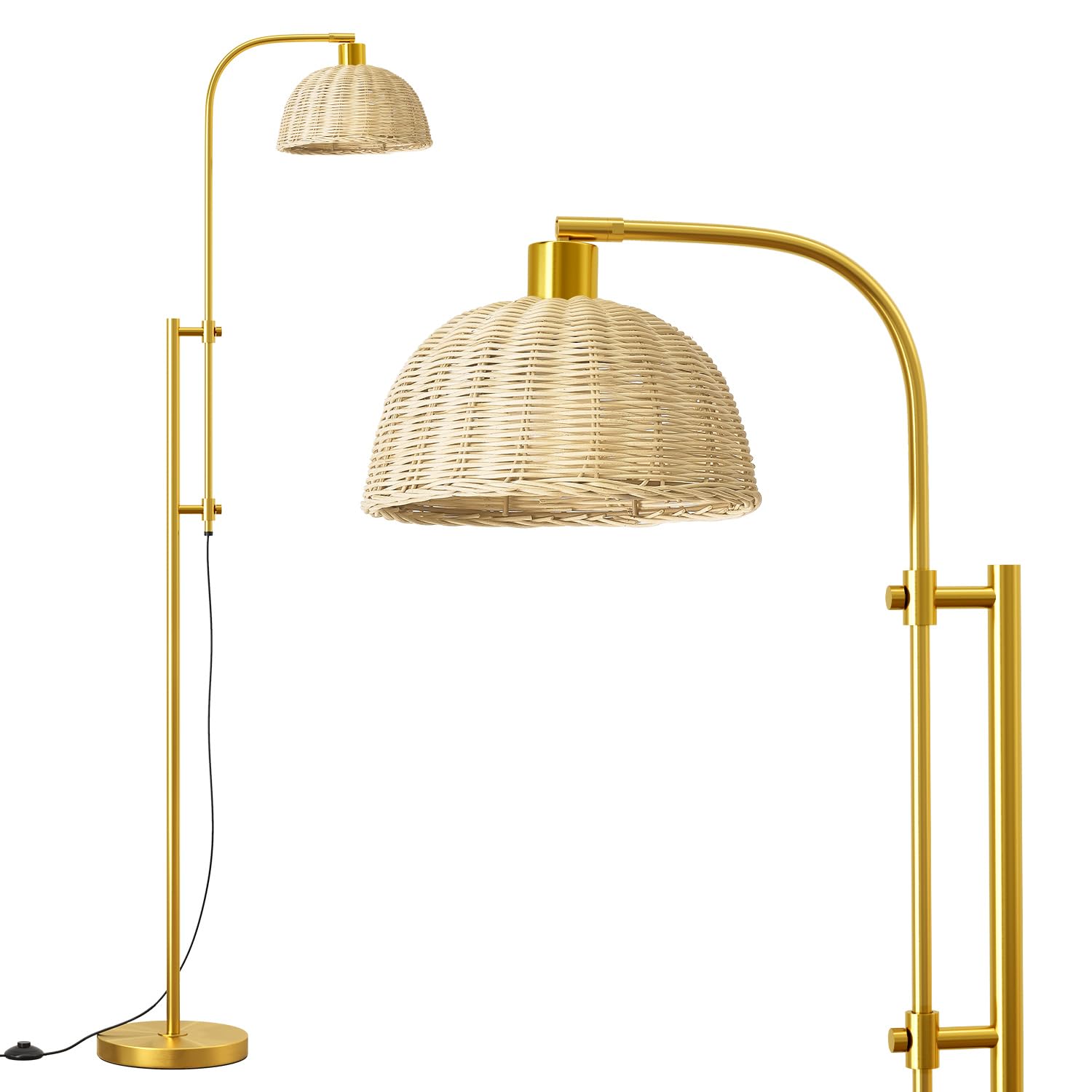 Oneach Lámpara de pie de arco de 65 pulgadas para sala de estar, lámparas de pie doradas de altura ajustable con pantalla de ratán