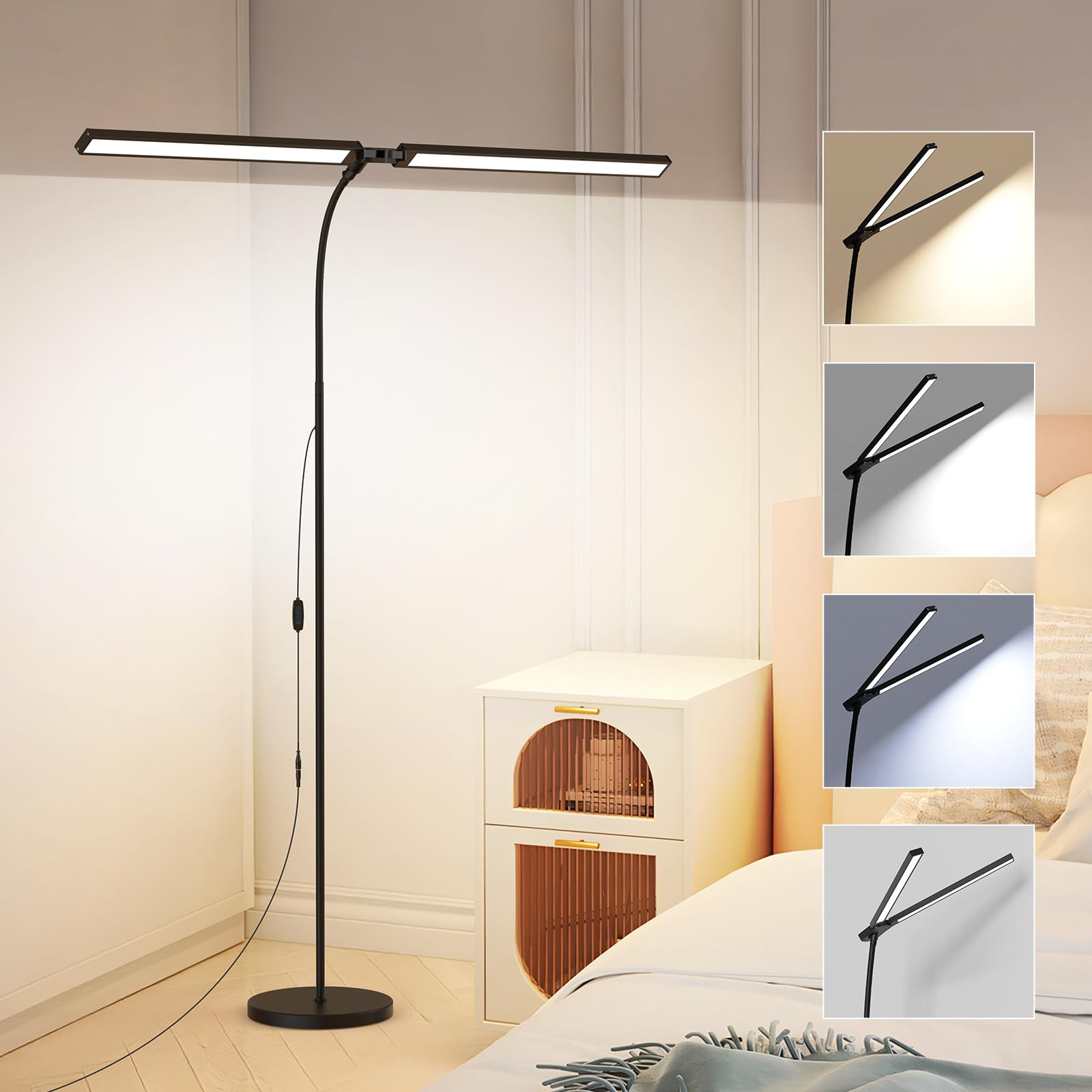 chiphy – Lámpara de pie regulable de 61” de alto, 2 bombillas LED de 12 W con 3 niveles de brillo ajustables, pantalla de tela bla
