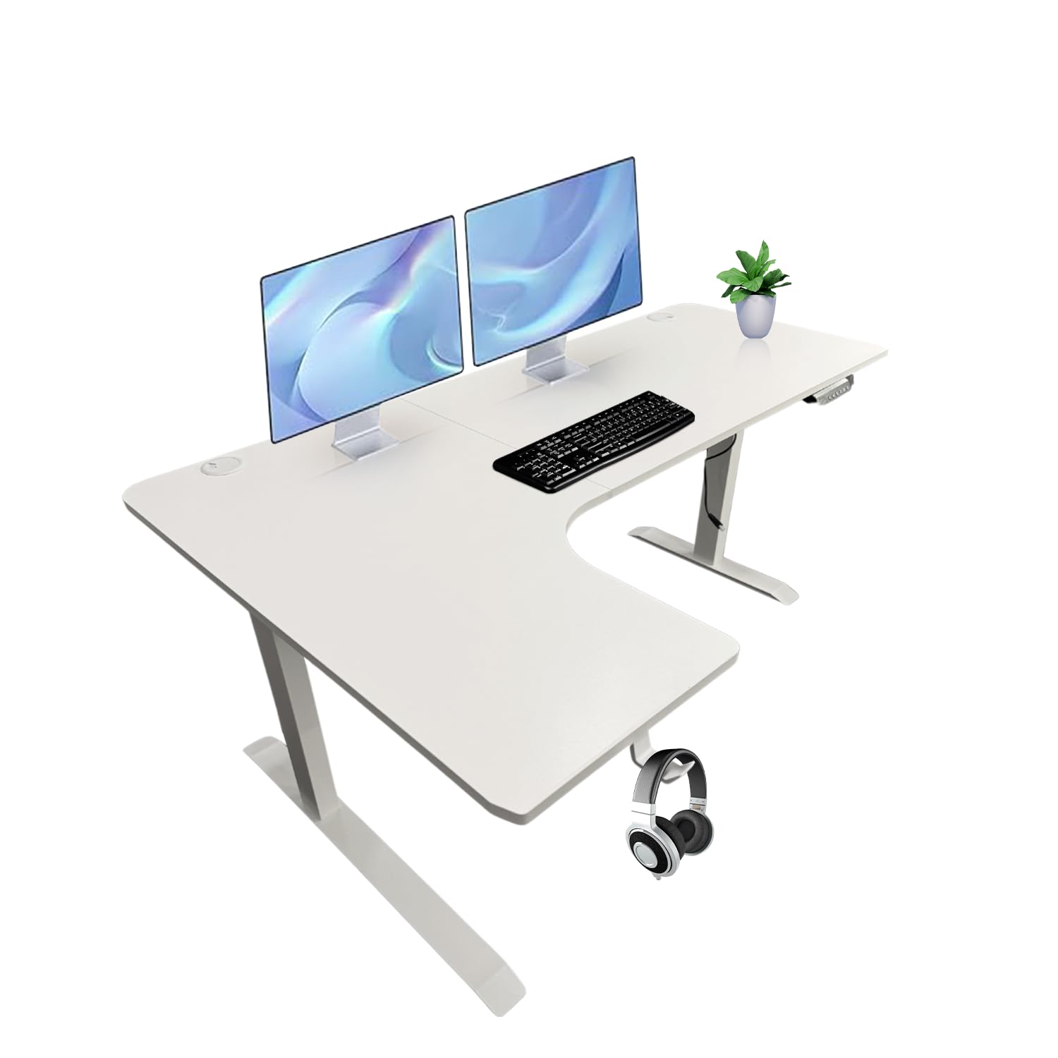 Escritorio eléctrico de esquina en forma de L de 63 pulgadas con parte superior blanca y marco blanco para oficina en casa