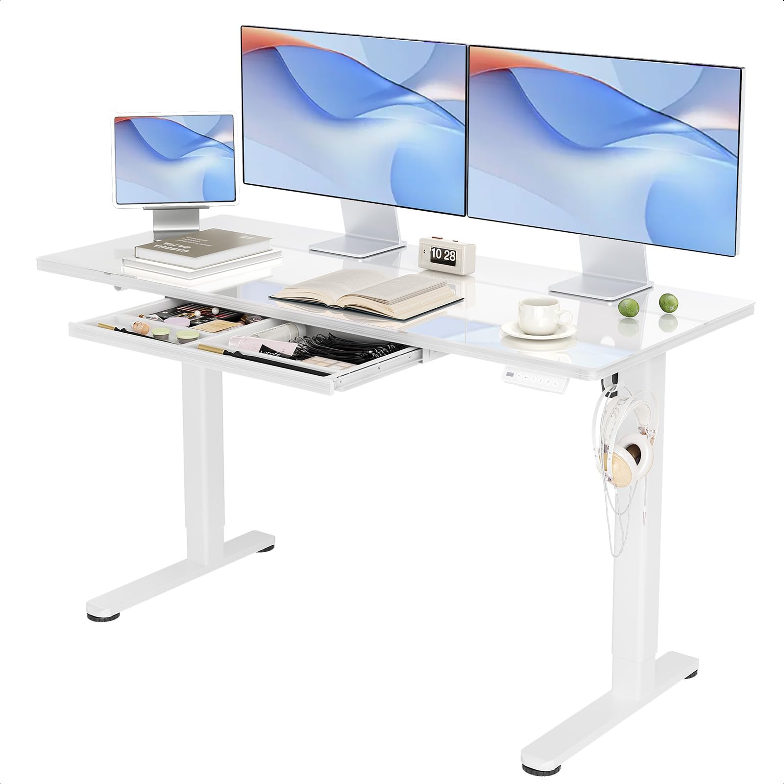 INNOVAR Escritorio de pie de cristal con cajones, escritorio eléctrico de altura ajustable de 55 x 24 pulgadas, escritorio de pie