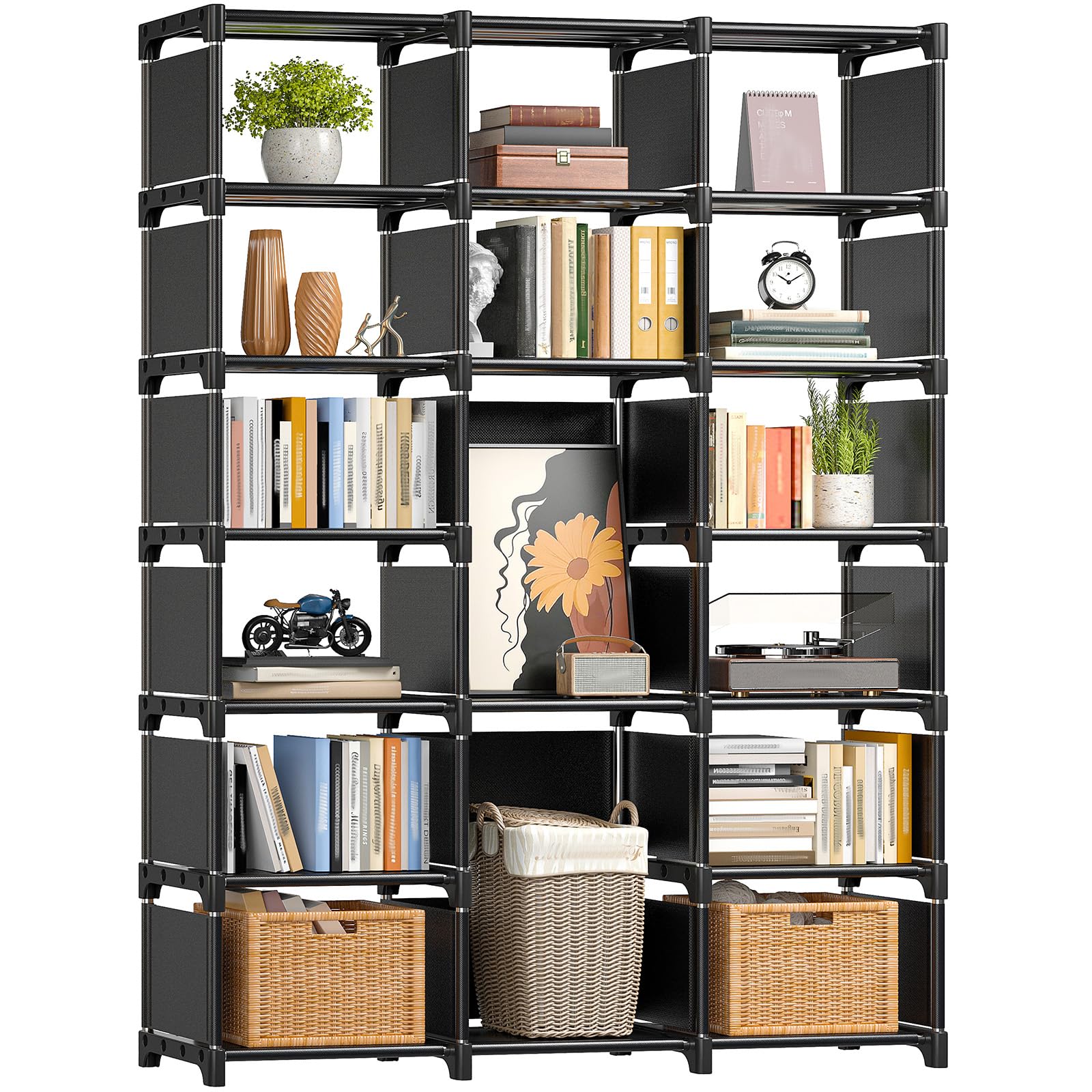 REIBII Estantería alta para libros, color negro, 16 cubos organizadores de almacenamiento para dormitorio, oficina, sala de estar,