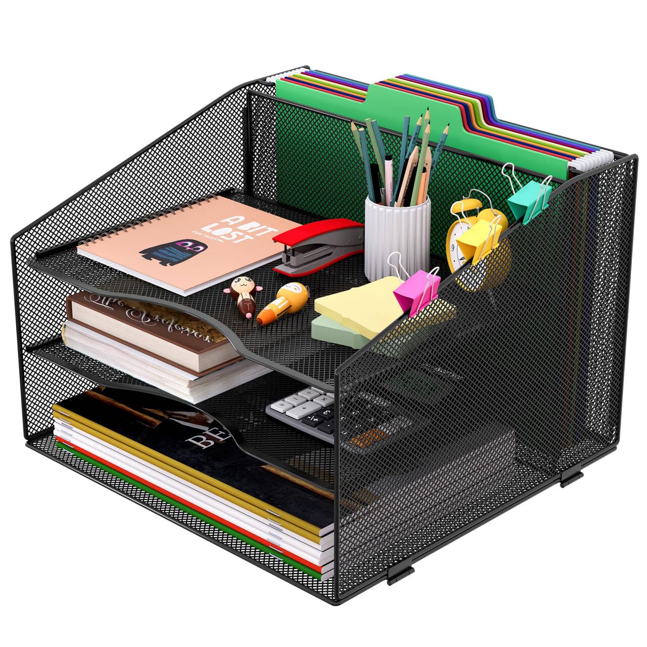 CAXXA Bandejas de malla de 4 niveles con sección vertical vertical para colgar archivos, organizador de escritorio de suministros