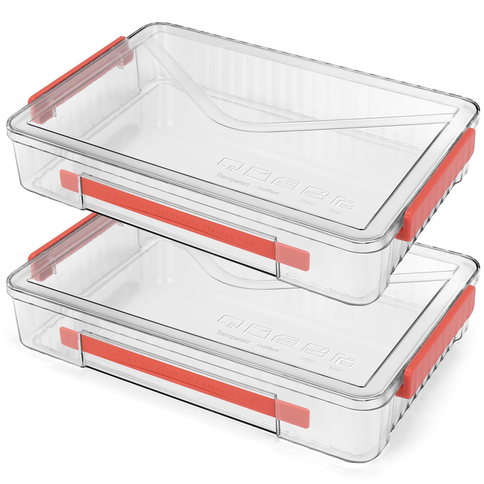 Paquete de 2 cajas de plástico transparente con tapas de cierre, caja de archivos de certificados con asa, caja de almacenamiento
