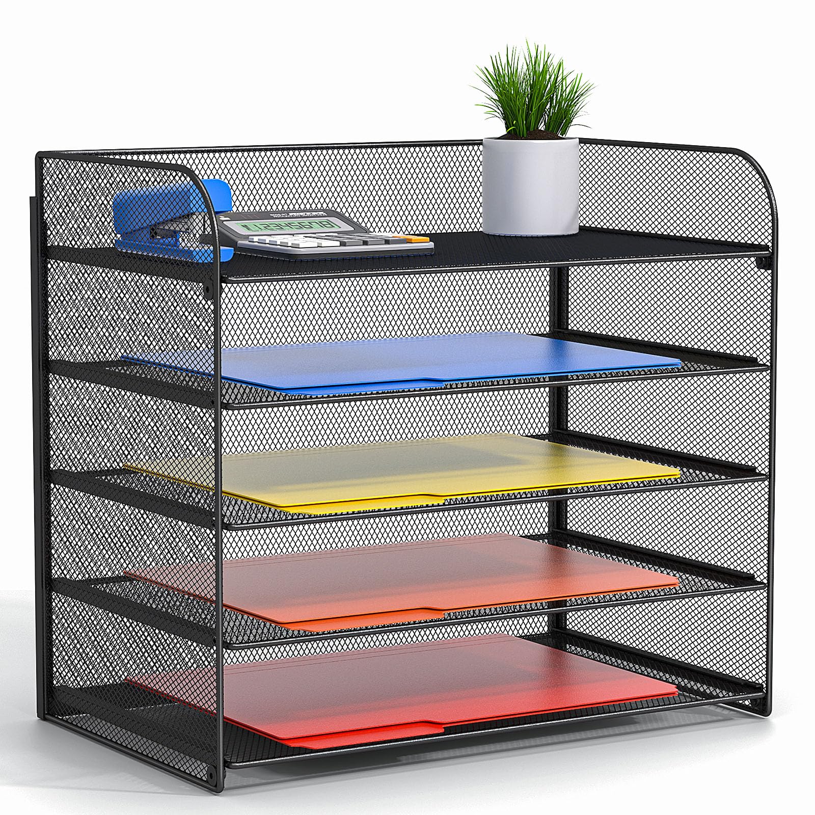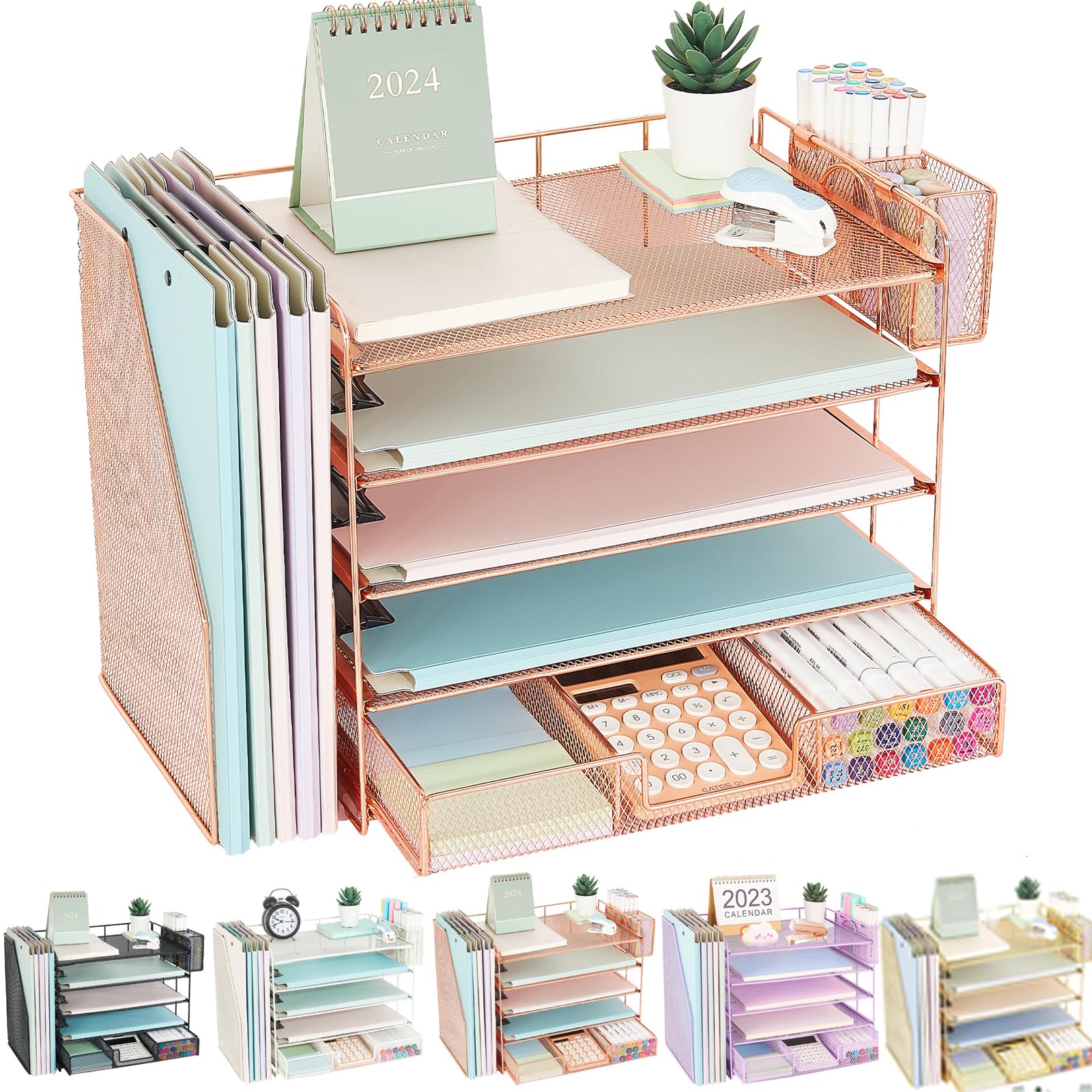 Youbetia Organizador de bandeja de papel de 5 niveles con soporte para archivos de malla, accesorios de escritorio y espacio de tr