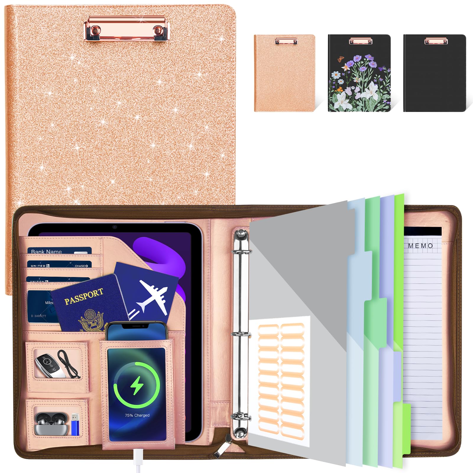 Portafolio de cuero con almacenamiento en portapapeles, carpeta extraíble de 3 anillos con cremallera de 1 pulgada, organizador de