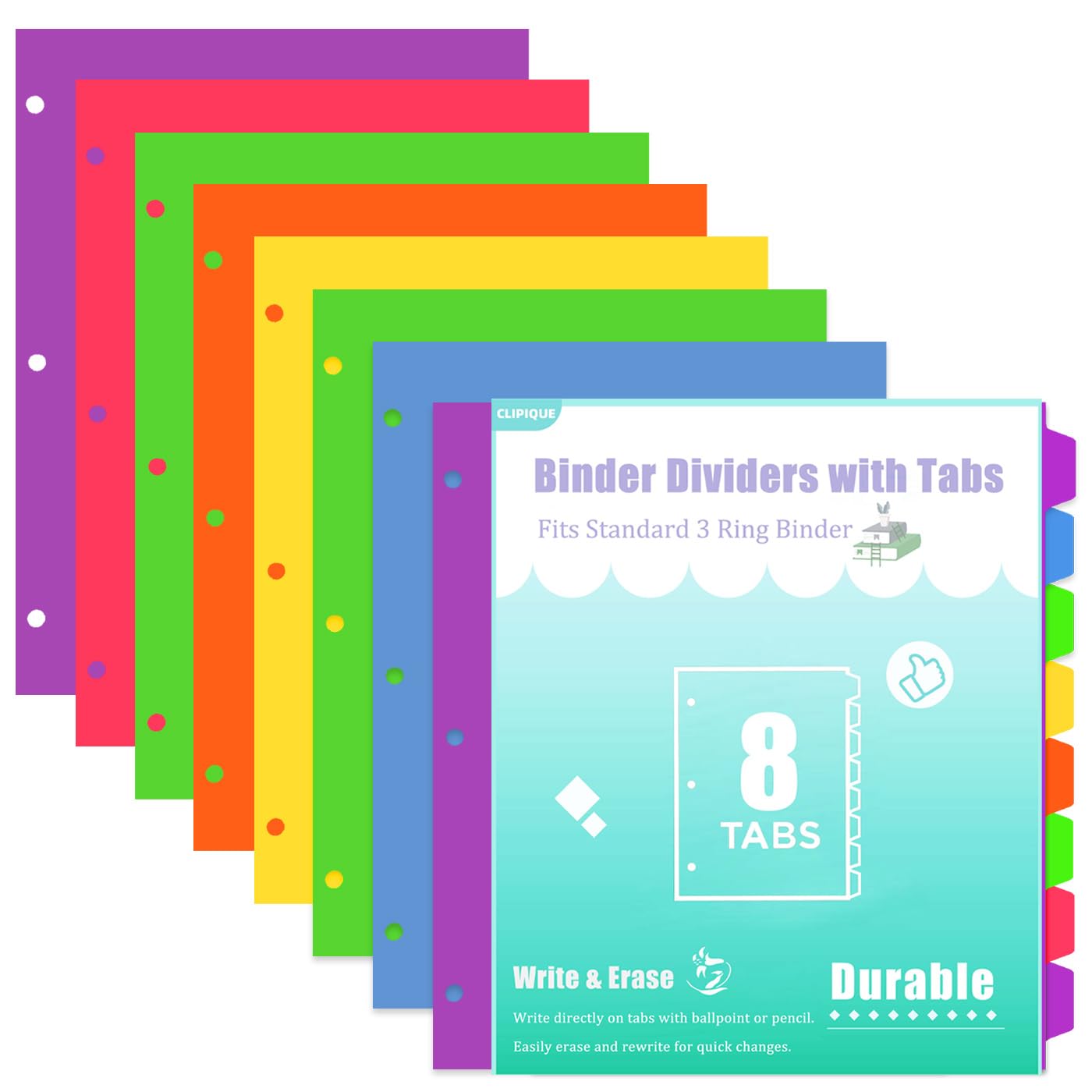 Separadores coloridos de 3 anillos de 8 pestañas con pestañas de índice personalizables, separadores de páginas de plástico durade