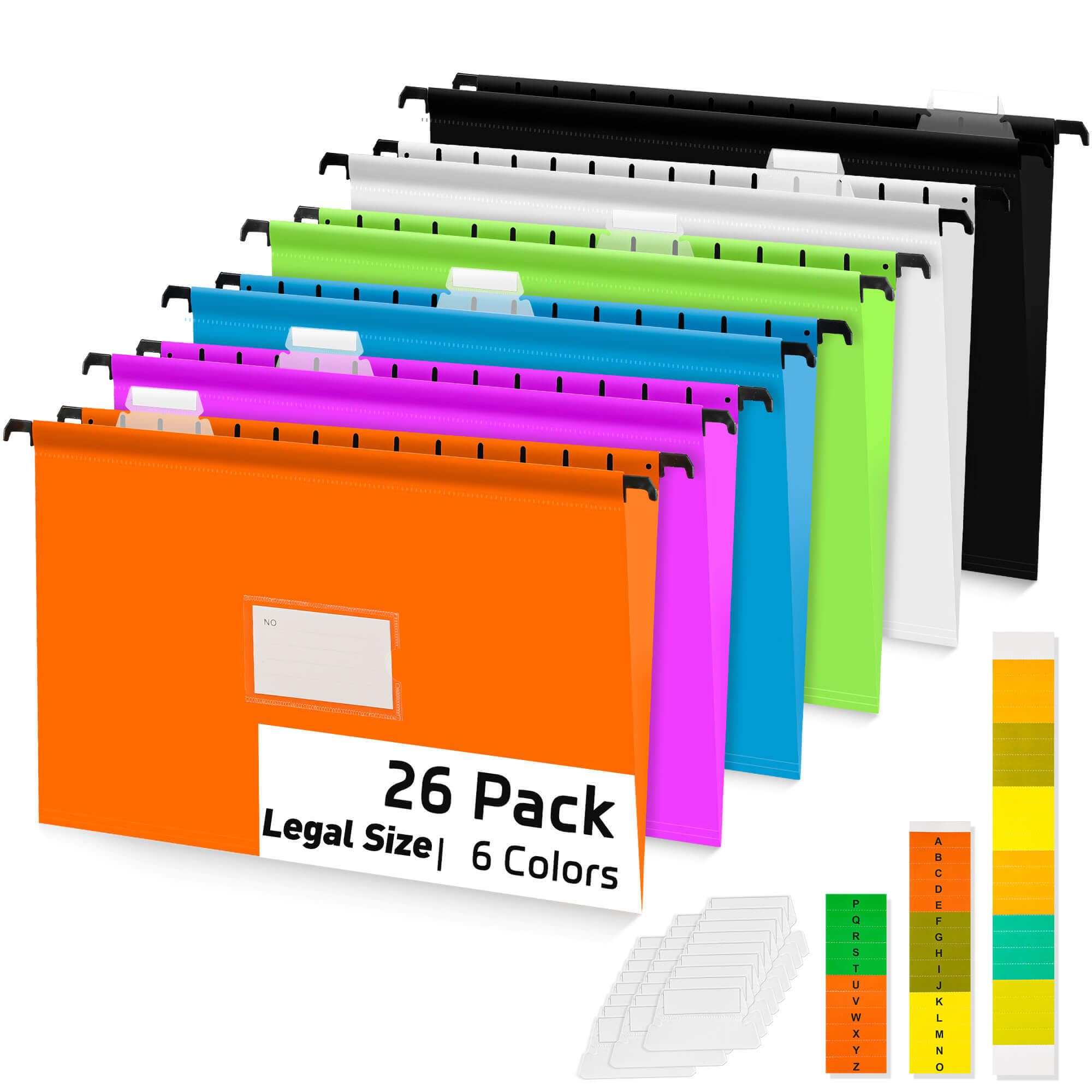 BOENFU Carpetas colgantes de plástico de tamaño legal con pestañas, paquete de 26 unidades A-Z, colores surtidos, separadores de a