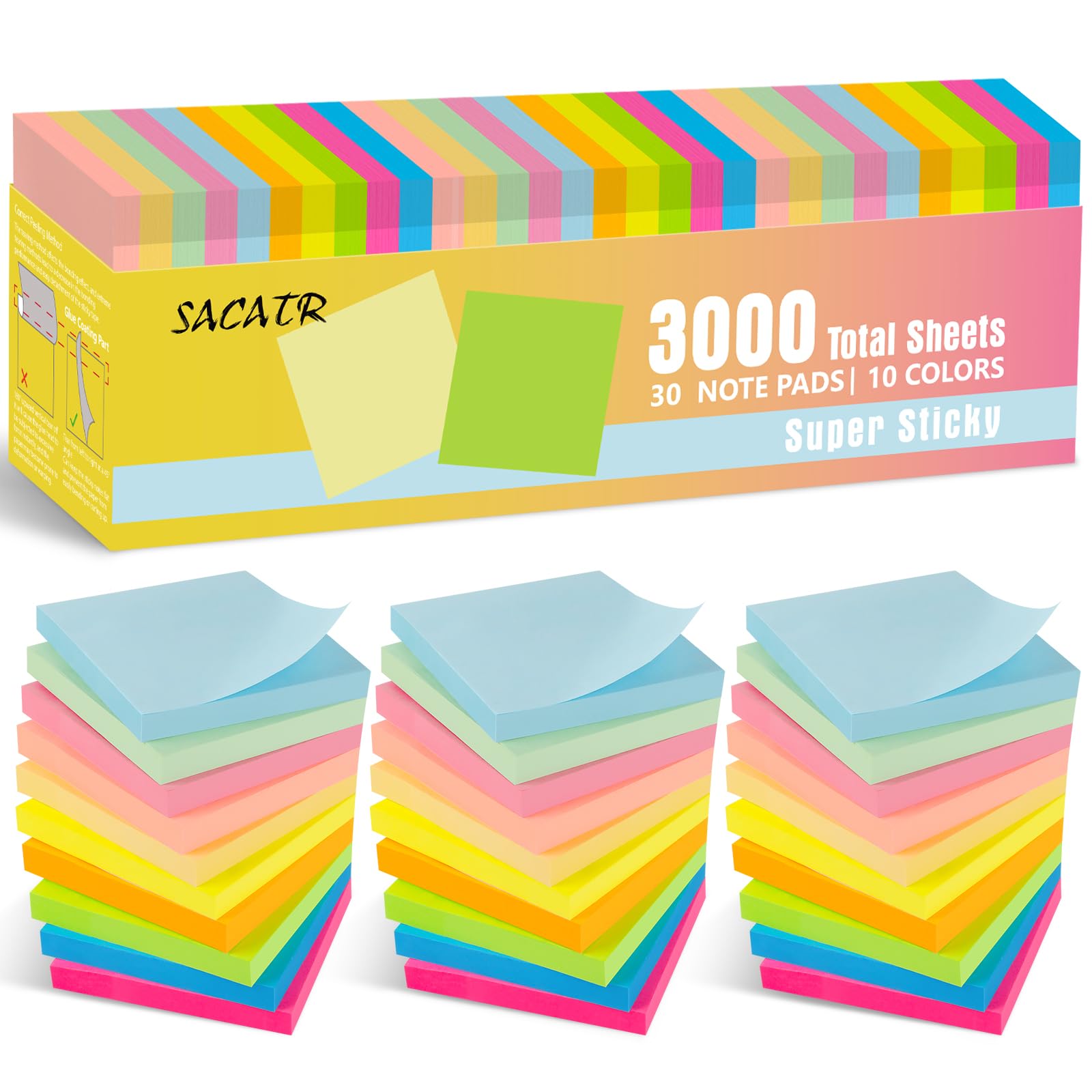 30 blocs de notas adhesivas, blocs de notas adhesivas de 3 x 3 pulgadas, 10 notas adhesivas de colores brillantes, bloc de notas a