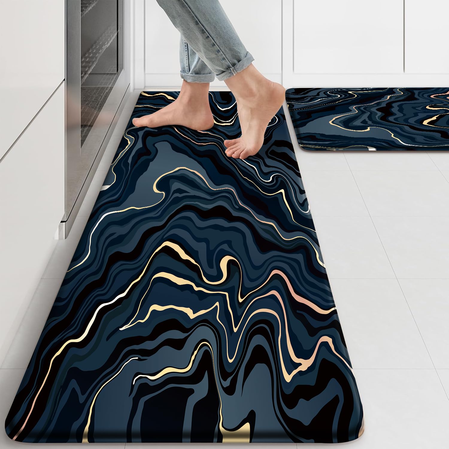 Juego de 2 tapetes de cocina azules acolchados antifatiga, diseño abstracto de mármol dorado, impermeable, antideslizante, cómodo,