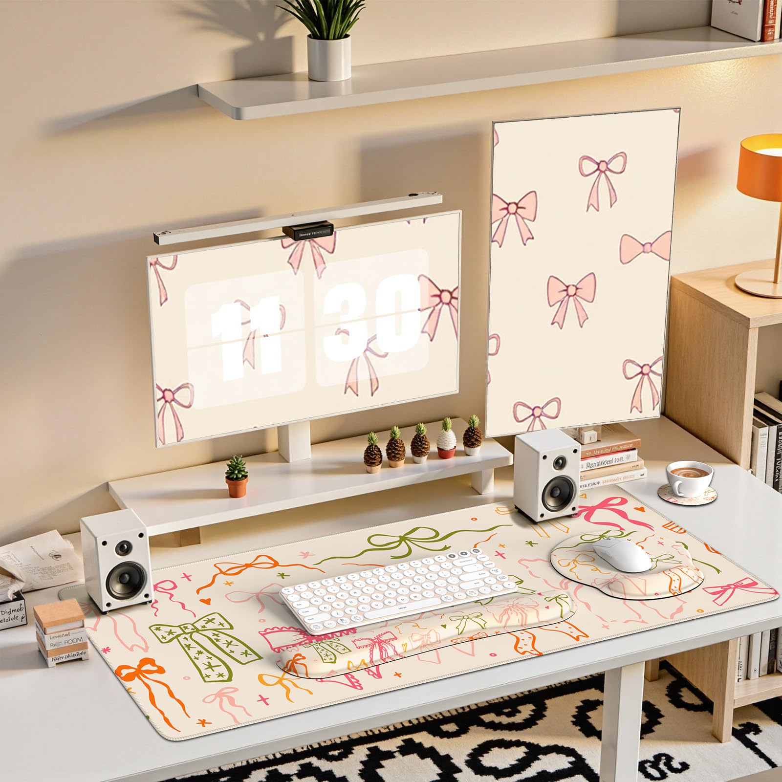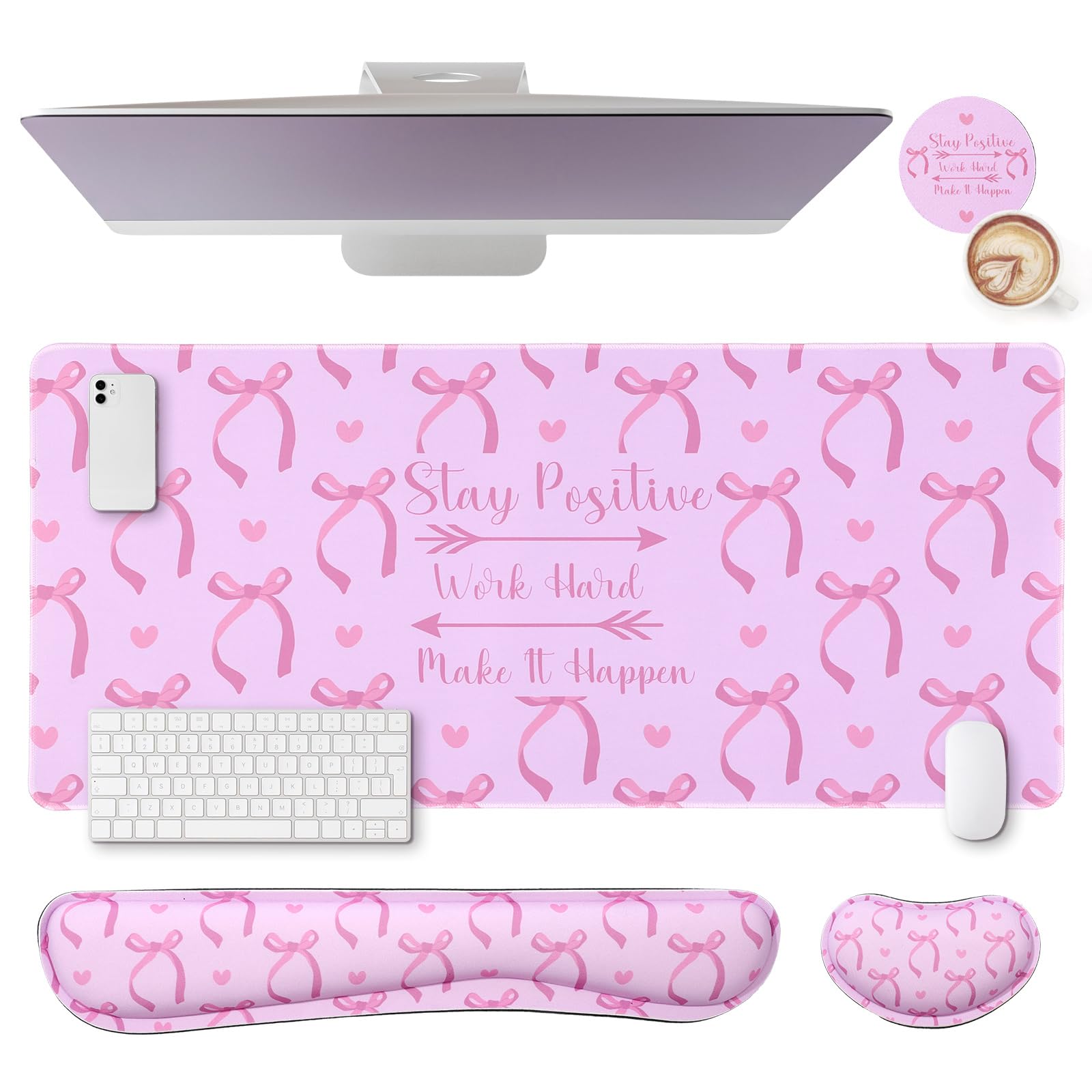 Alfombrilla para mouse, alfombrilla de escritorio con lazo rosa grande, 4 en 1, XXL con cita positiva, reposamuñecas para teclado,