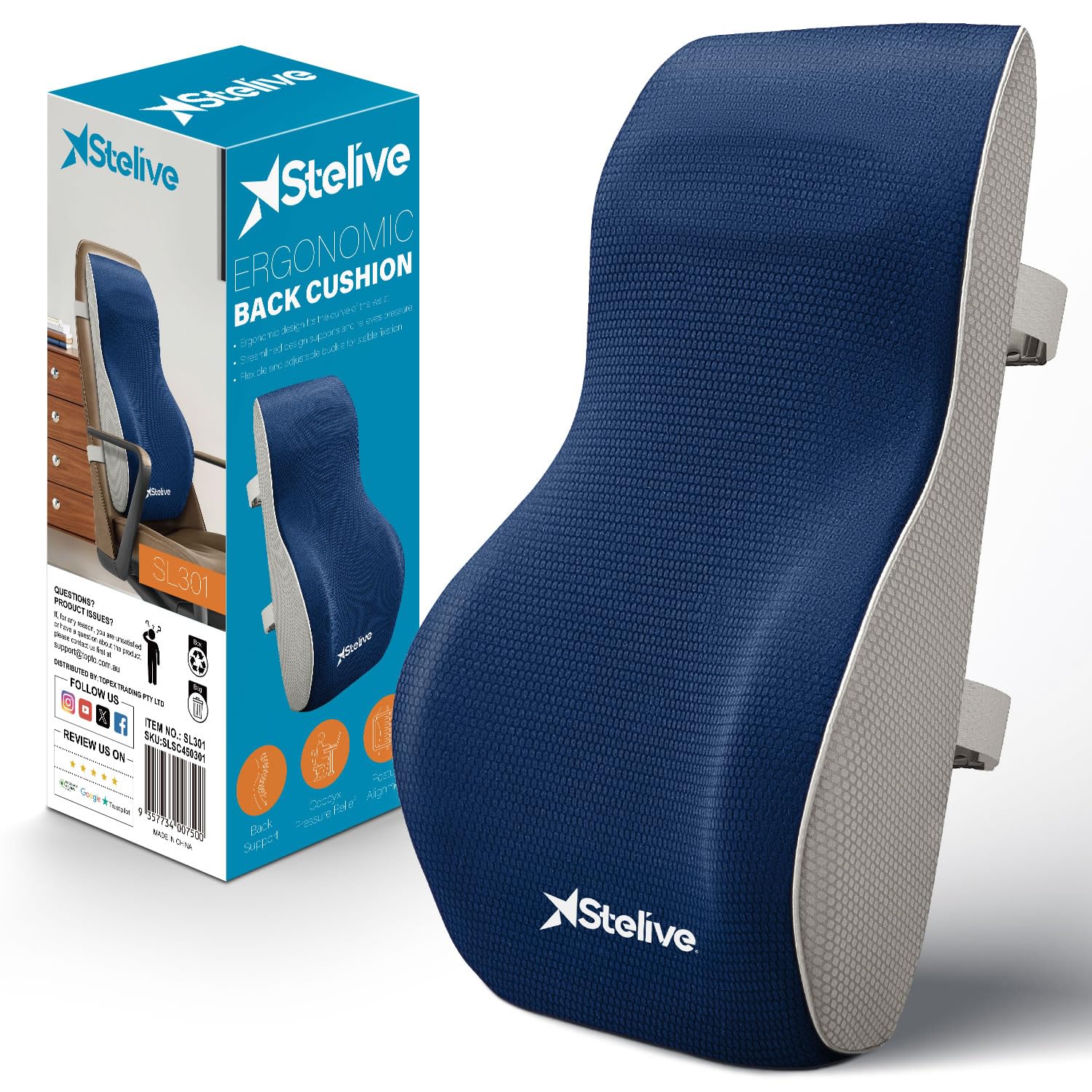 Cojín ergonómico de respaldo lumbar, cojín de espuma viscoelástica, respaldo ortopédico con funda transpirable y correas ajustable