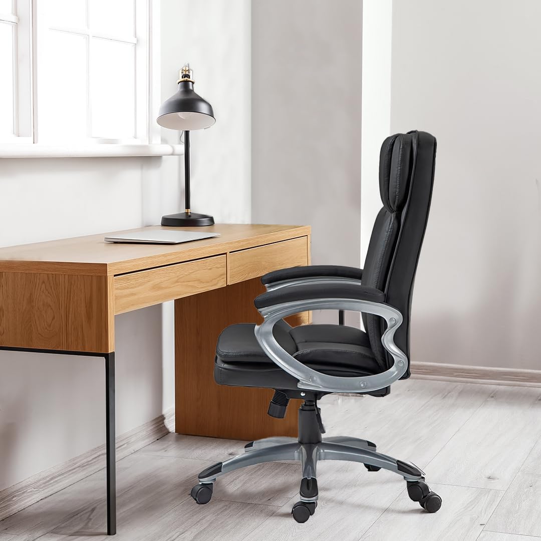 Silla de oficina giratoria ergonómica de cuero negro con reposabrazos, elegante silla de oficina en casa, 20.1 pulgadas de ancho x