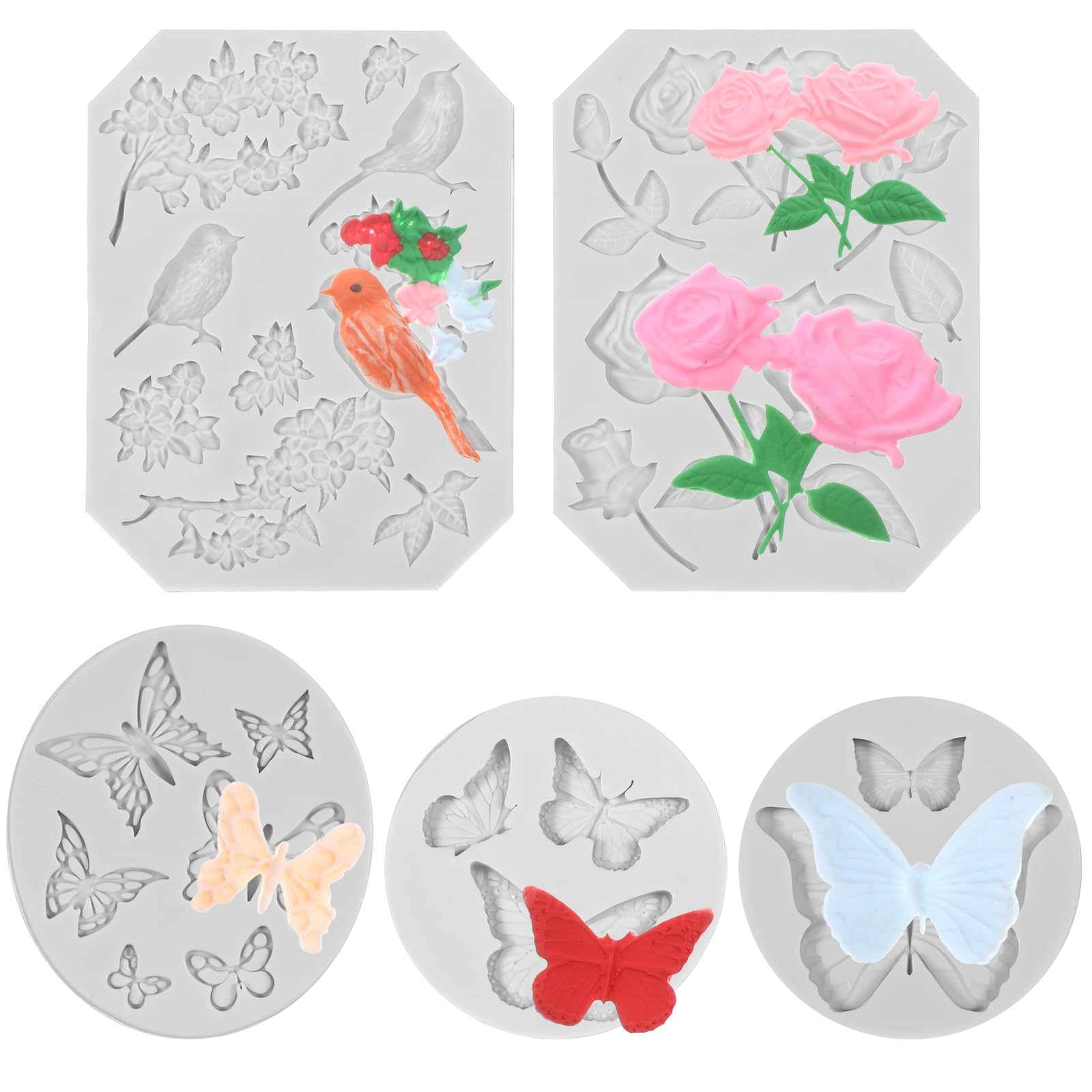 Butterfly Flower Silicone Mold, 5 Pcs Rose Flower Stems Birds Butterfly Polymer Clay Molds Fondant Chocolate Molds for DIY Crafts