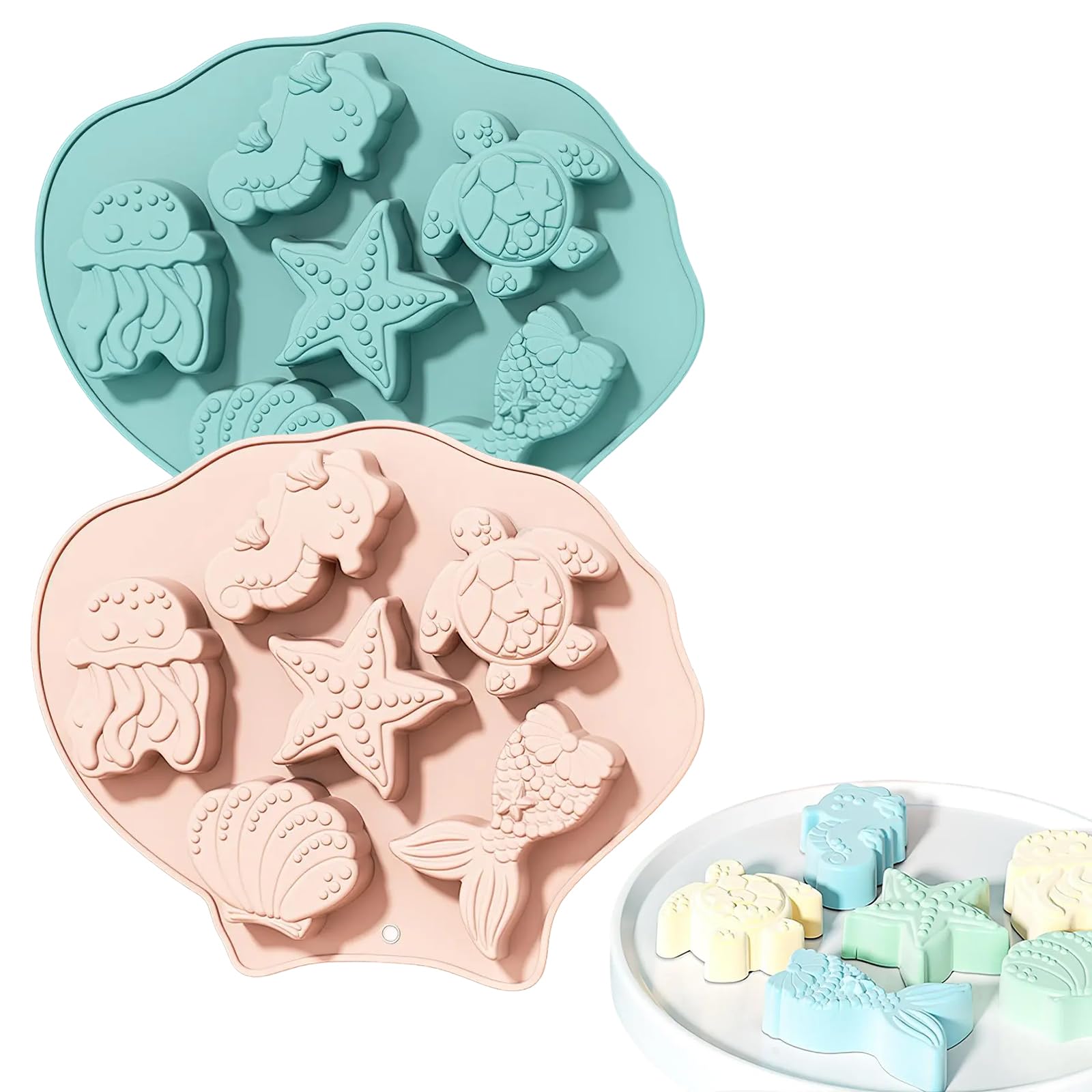 2 moldes de silicona con temática de organismo marino, sirena, estrella de mar, conchas de mar, tortugas de mar, caballitos de mar