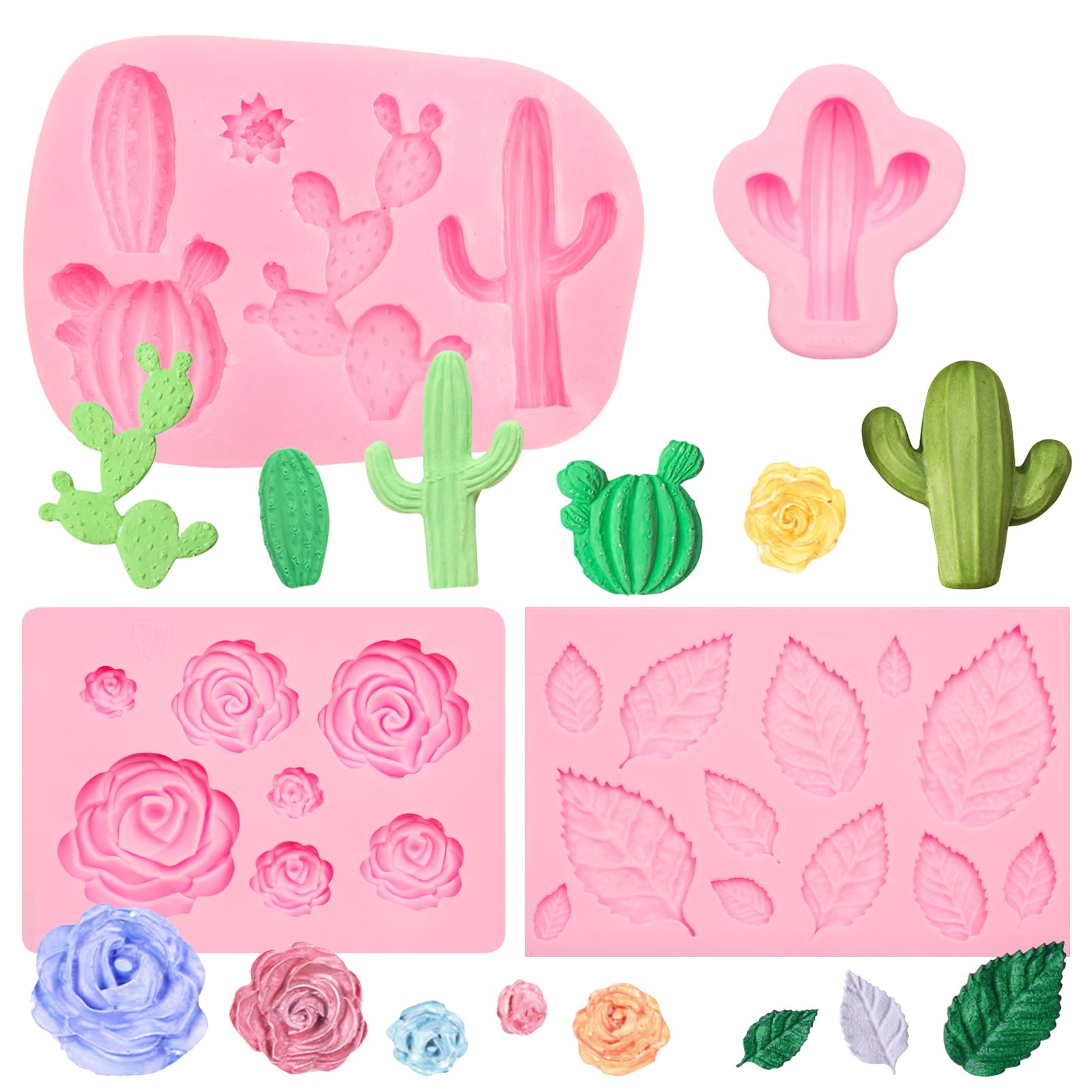 Leaf Chocolate Mold 4 Pcs, Flower Silicone Molds for Baking Cactus Cupcake Toppers Fondant Mold Cake Decoration Candy Polymer Clay