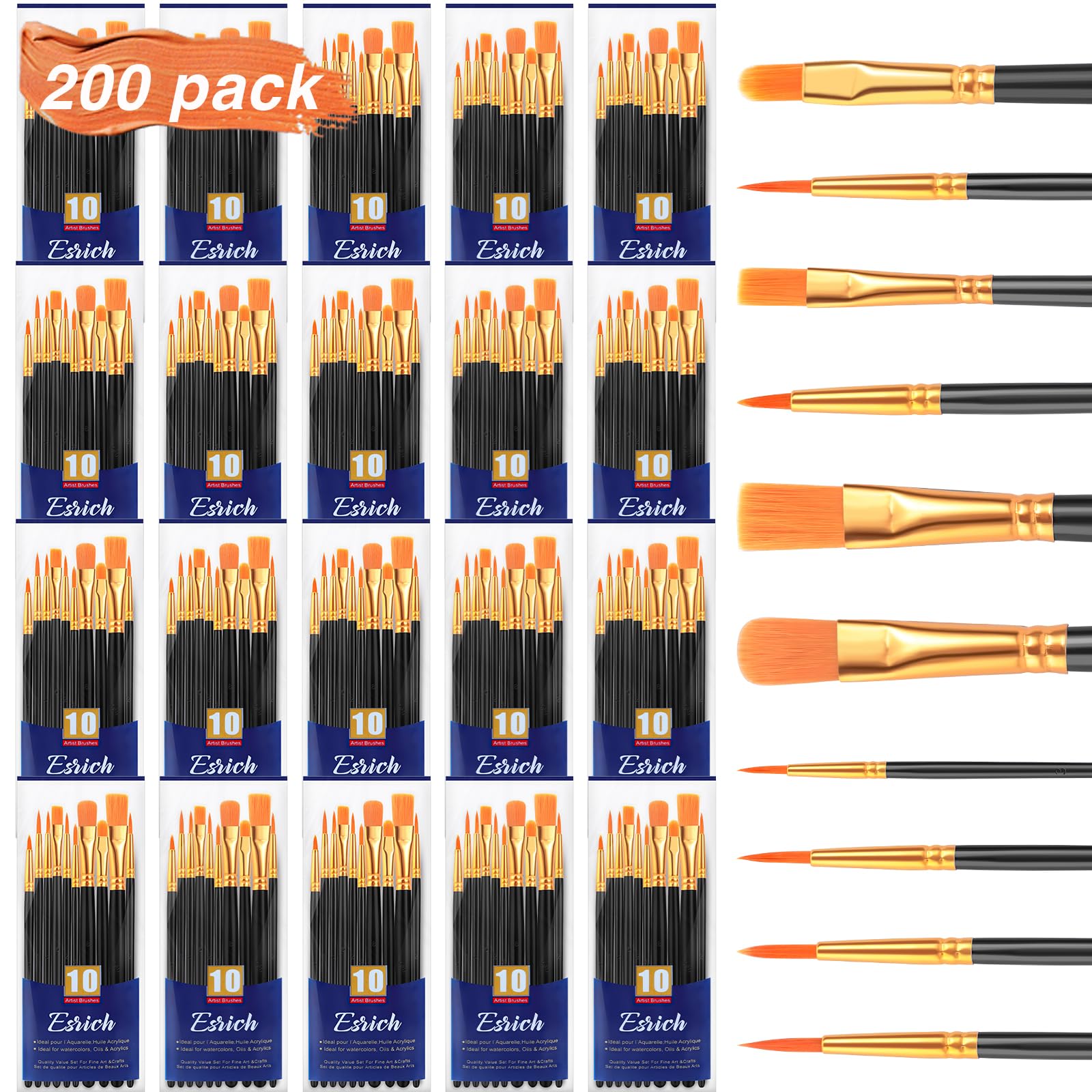 ESRICH Juego de pinceles de pintura acrílica, 20 paquetes/200 pinceles de nailon para el cabello, juego de pinceles de pintura ade